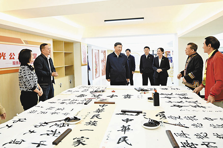 南寧市良慶區蟠龍社區是一個多民族聚居社區。習近平來到社區黨群服務中心,聽取現場工作人員關於開展主題教育、促進便民惠企、舉辦民族特色活動等情況介紹,對他們堅持黨建引領聚合力、服務為本促發展的做法表示肯定。在文體活動室,他饒有興致地觀看社區居民習練書法、合唱民歌,同大家親切交流,鼓勵社區充分利用人才、場地等資源,開展更多健康有益、啟智潤心的文化活動,以此激發更大的正能量。習近平指出,社區是基層自治的基本單元,是國家治理體系的基層基礎。通過社區這個平台,辦好「一老一小」等民生實事和公共事務,積極回應群眾關切,是中國特色基層治理的顯著優勢,要把這一優勢發揮好。建設多民族群眾互嵌式社區,是促進各族群眾交往交流交融的重要途徑。廣西建設鑄牢中華民族共同體意識示範區,要從基層社區抓起,通過扎實的社區建設、有效的社區服務、豐富的社區活動,營造各族人民一家親的濃厚氛圍,把民族團結搞得更好。