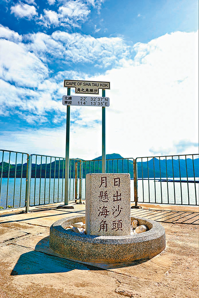 沿着新樓街前往沙頭角公眾碼頭途中會先到達沙頭角之角,該處豎立一塊刻上「日出沙頭,月懸海角」的石碑。鄧炳強表示,相傳石碑源自一位清朝大臣到廣東沿岸視察,看見該處風光如畫,題下上述詩句,「沙頭角」因而得名。遊人在該處能盡覽沙頭角海灣的海岸線,向左眺望的群樓則為鹽田區。
