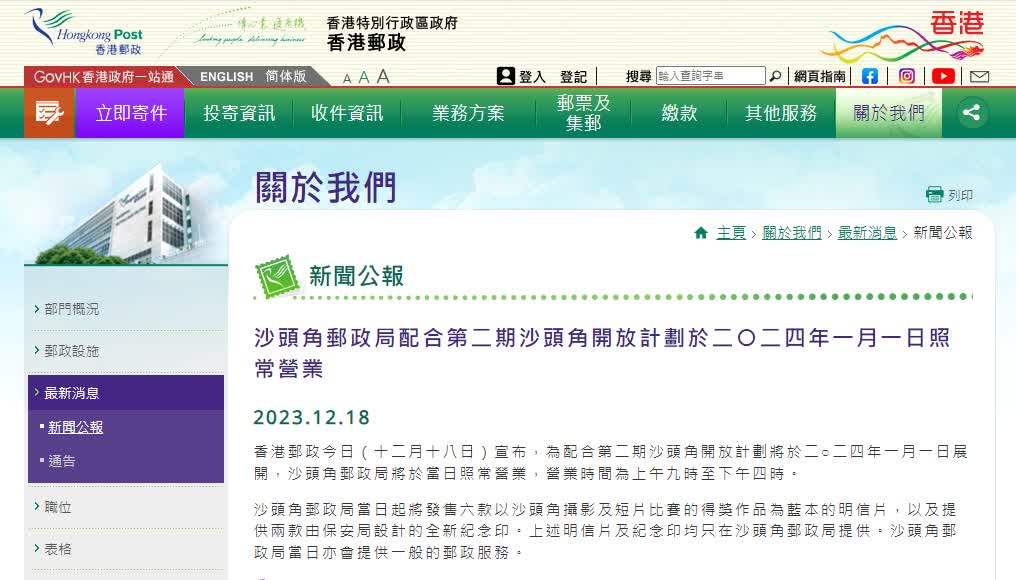 香港郵政今日(18日)宣布,為配合第二期沙頭角開放計劃將於2024年1月1日展開,沙頭角郵政局將於當日照常營業,營業時間為上午9時至下午4時。