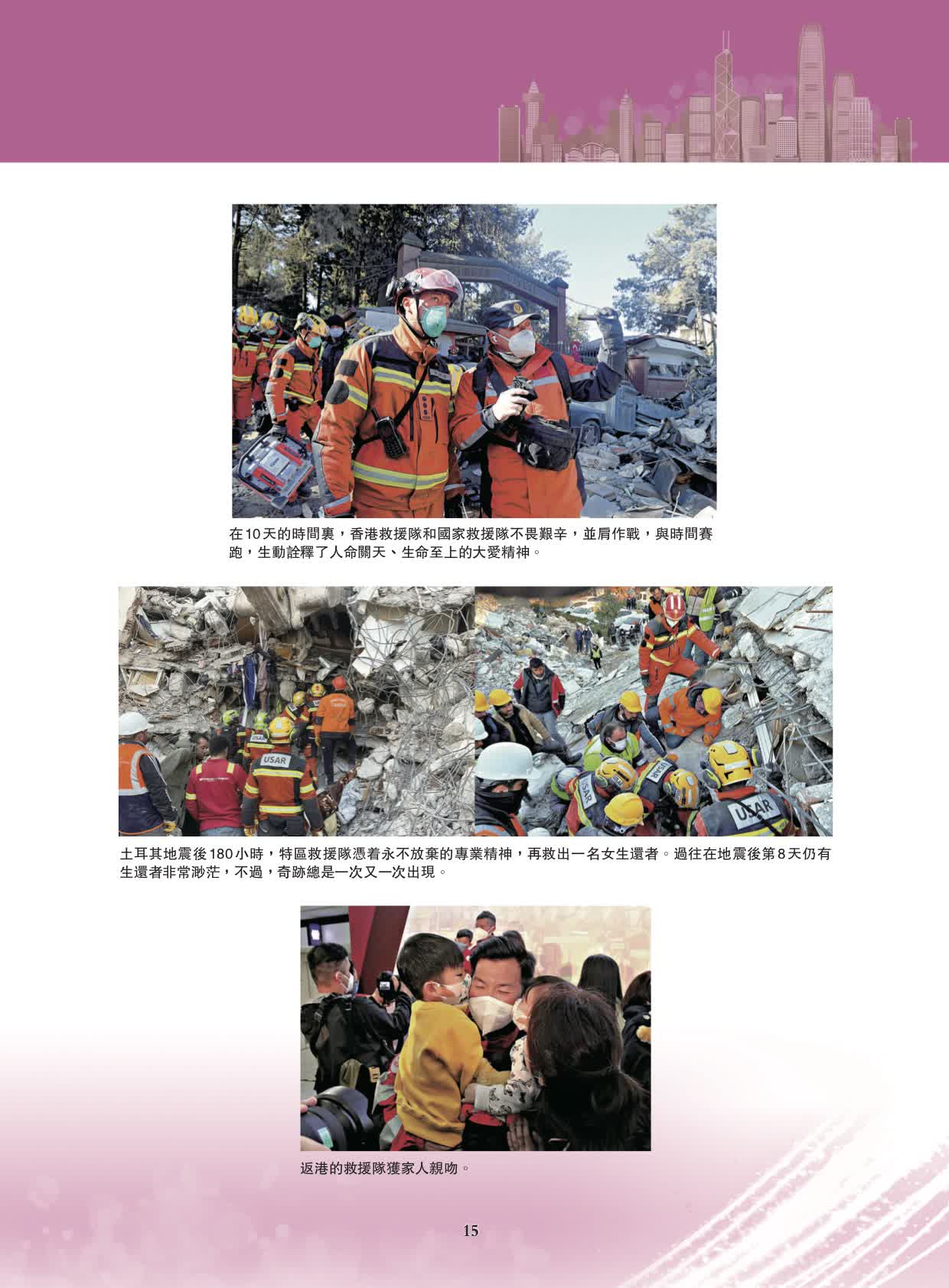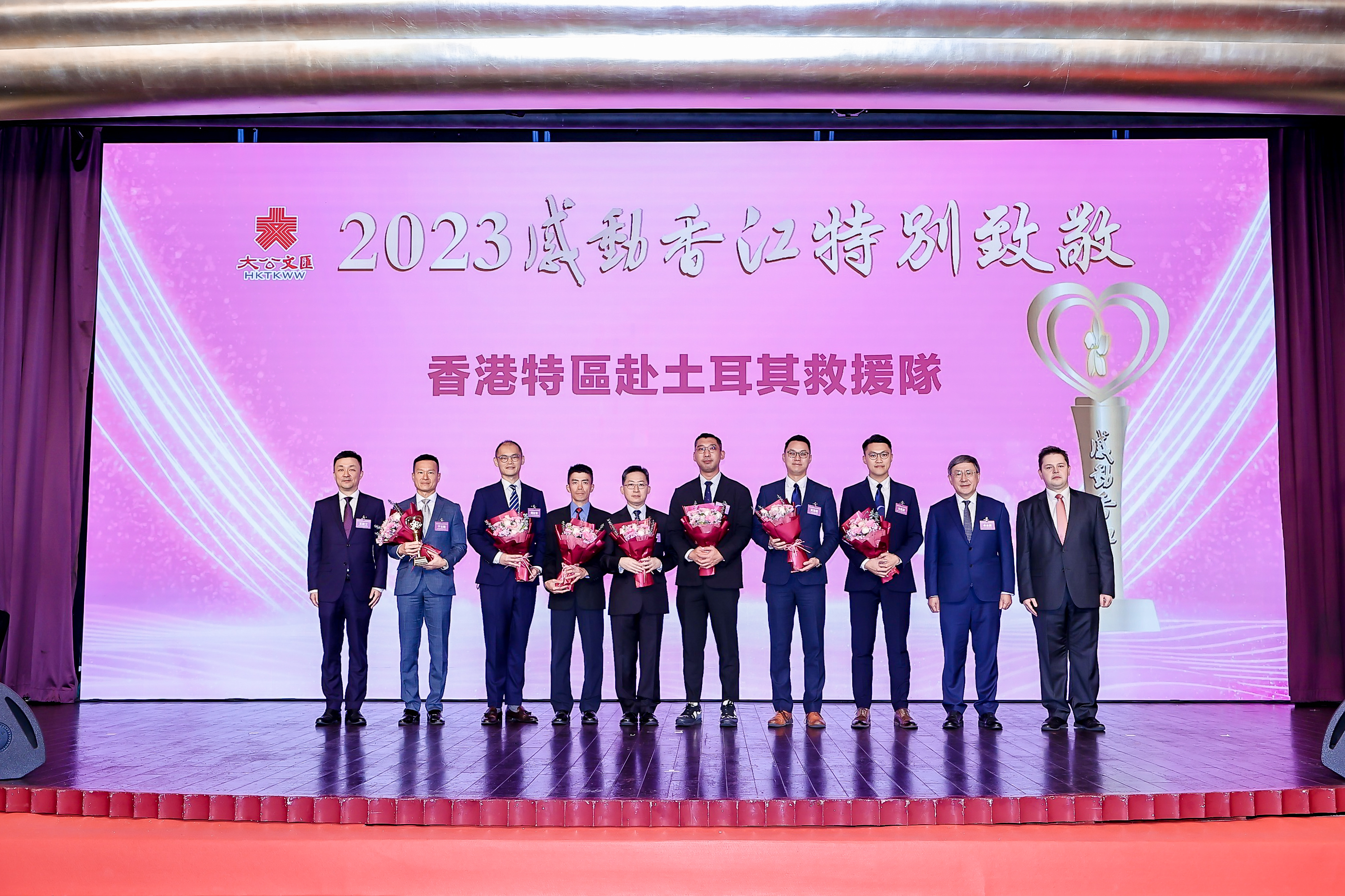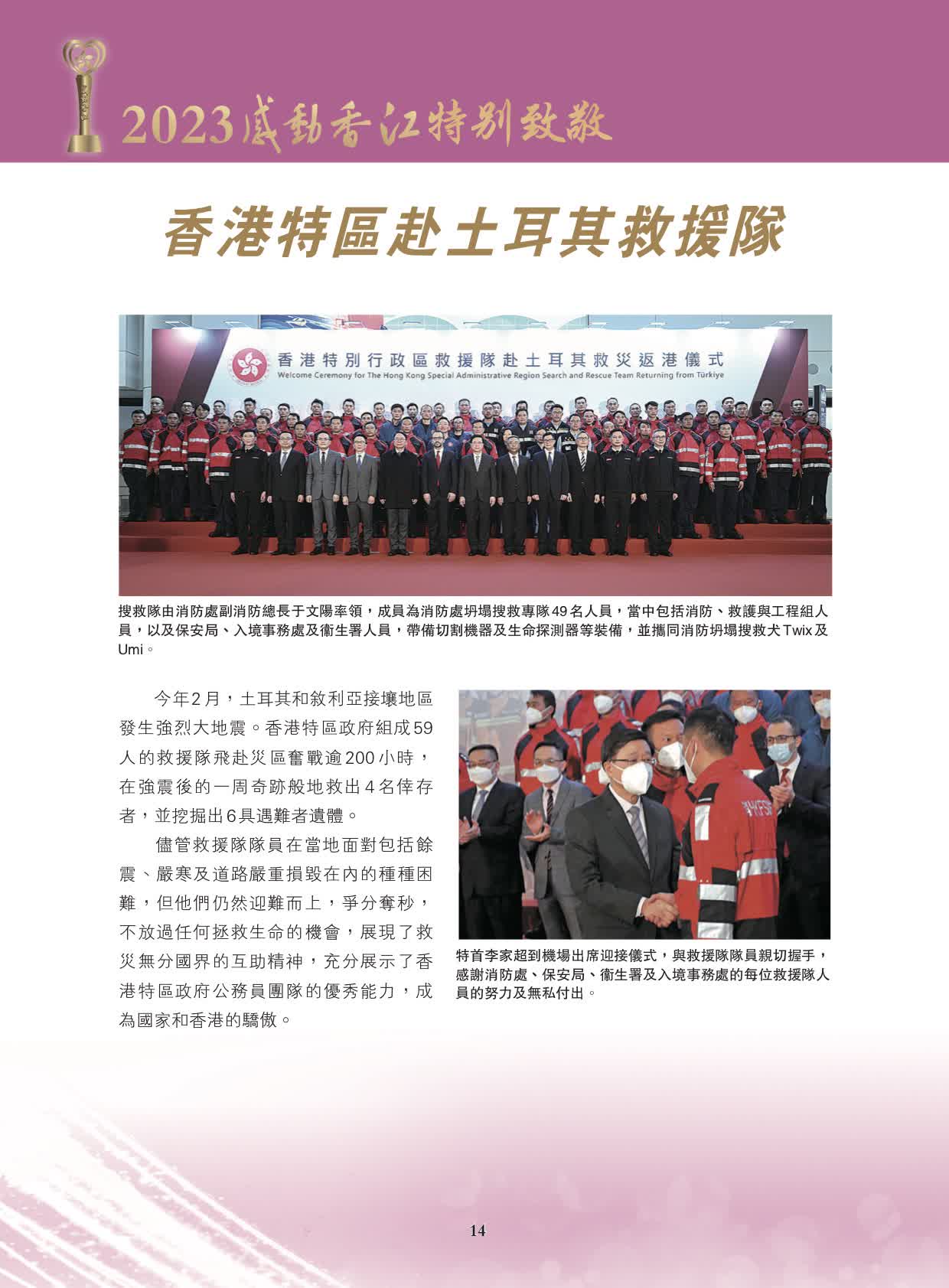 此外,香港特區赴土耳其救援隊獲頒發「2023感動香江特別致敬」獎。今年2月,土耳其和敘利亞接壤地區發生強烈大地震,香港特區政府組成59人的救援隊飛赴災區奮戰逾200小時,在強震後的一周奇跡般地救出4名倖存者,並挖掘出6具遇難者遺體。他們迎難而上,爭分奪秒,不放過任何拯救生命的機會,充分展現了救災無分國界的互助精神,展示了香港特區政府公務員團隊的優秀能力,是國家和香港的驕傲。