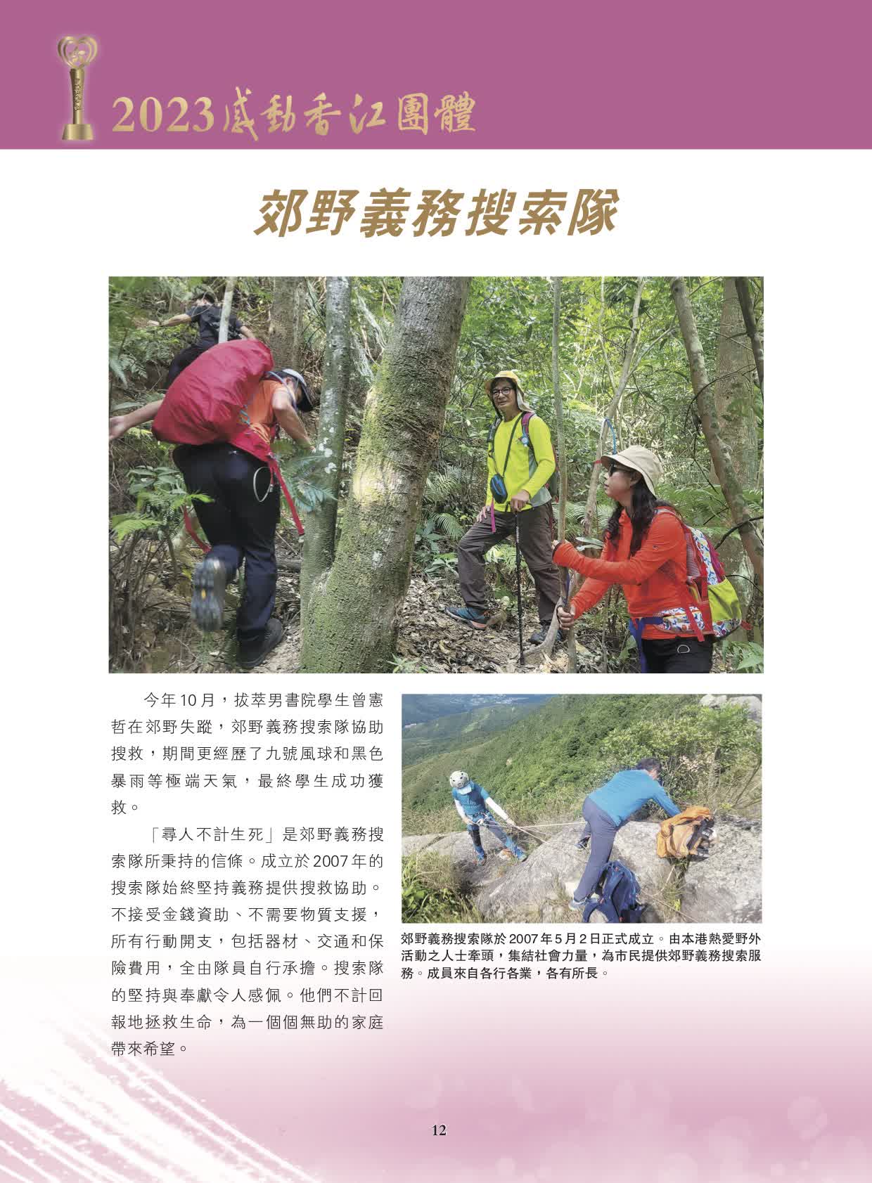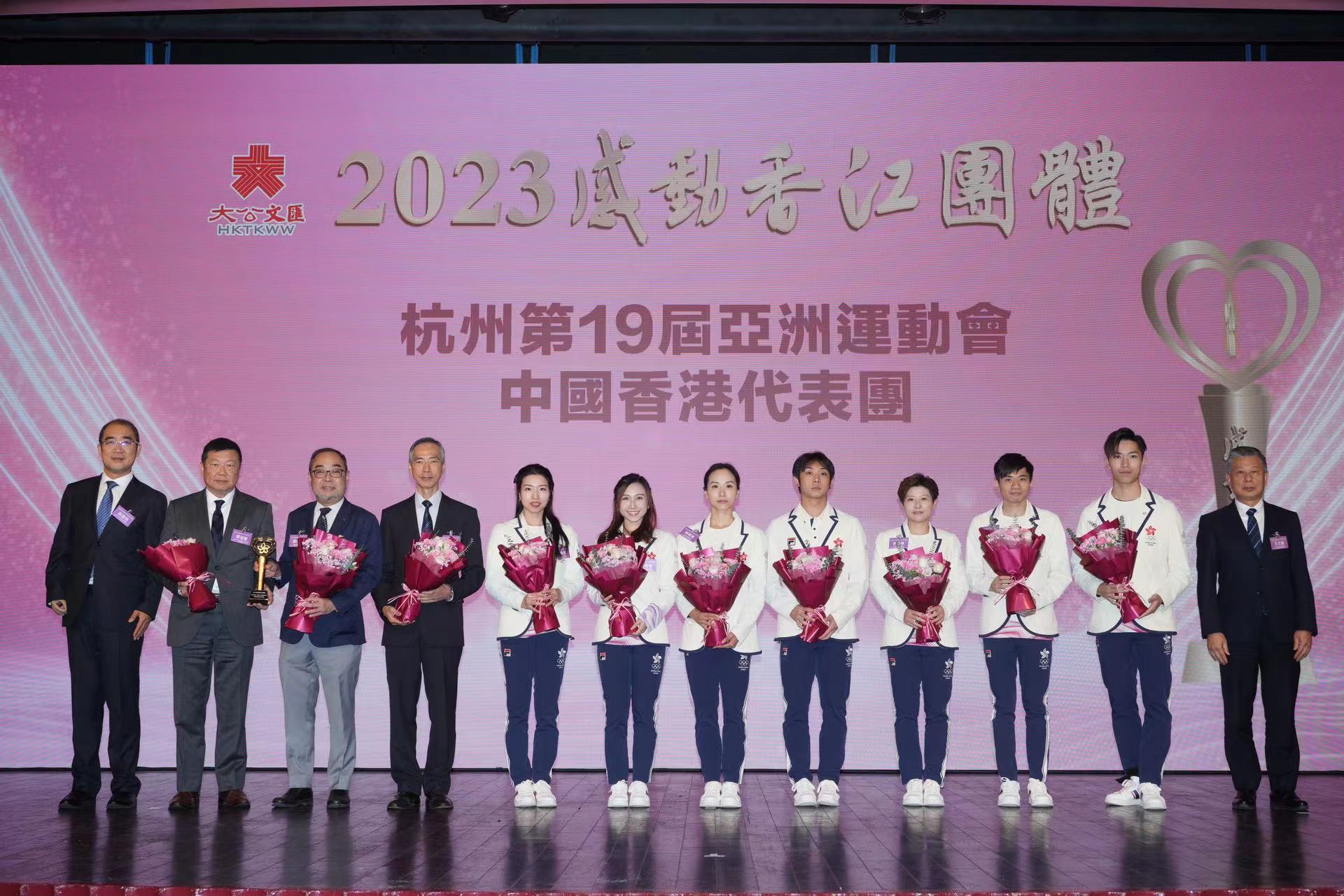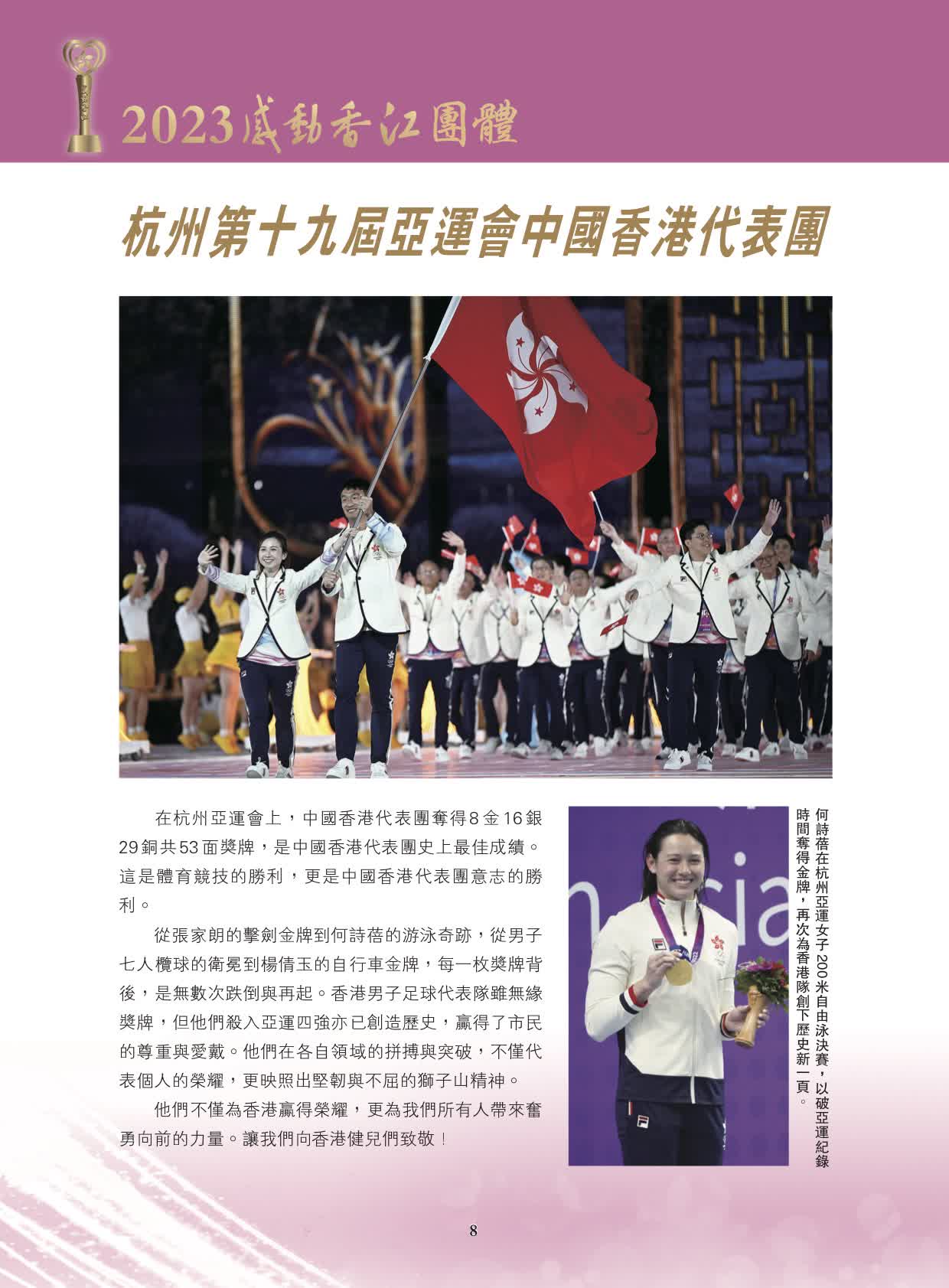 3個「2023感動香江團體」分別是:杭州第19屆亞洲運動會中國香港代表團,在杭州亞運會上,中國香港代表團奪得8金16銀29銅共53面獎牌,是中國香港代表團史上最佳成績。這是體育競技的勝利,更是中國香港代表團意志的勝利;杭州第4屆亞洲殘疾人運動會中國香港代表團,杭州第四屆亞殘運中國香港代表團在亞殘運會上交出的答卷,不僅是一份亮眼的成績單,更是一段激昂的樂章。8金15銀24銅共47枚獎牌,名列總獎牌榜第十;郊野義務搜索隊,今年10月,拔萃男書院學生曾憲哲在郊野失蹤,郊野義務搜索隊協助搜救,期間更經歷了九號風球和黑色暴雨等極端天氣,最終學生成功獲救,他們不計回報地拯救生命,為一個個無助的家庭帶來希望。