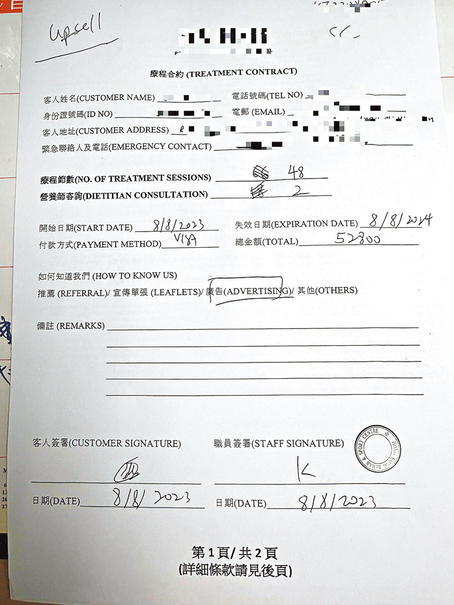 離開後,膽戰心驚的陳小姐立即報警,警員與中心職員交涉後,職員答應歸還第二份合約。然而,兩份合約都極度簡陋, 服務內容空洞籠統,中心還用品牌名義跟她簽約,而非「法人」,這樣殘缺不全的合約令陳小姐在過去兩個月的起訴過程處處碰壁,最終失望而回,「搵過晒立法會議員、消委會、海關等等,消委會及海關都話我的合約上沒有寫清楚服務內容,所以很難以《商品說明條例》控告對方。」
