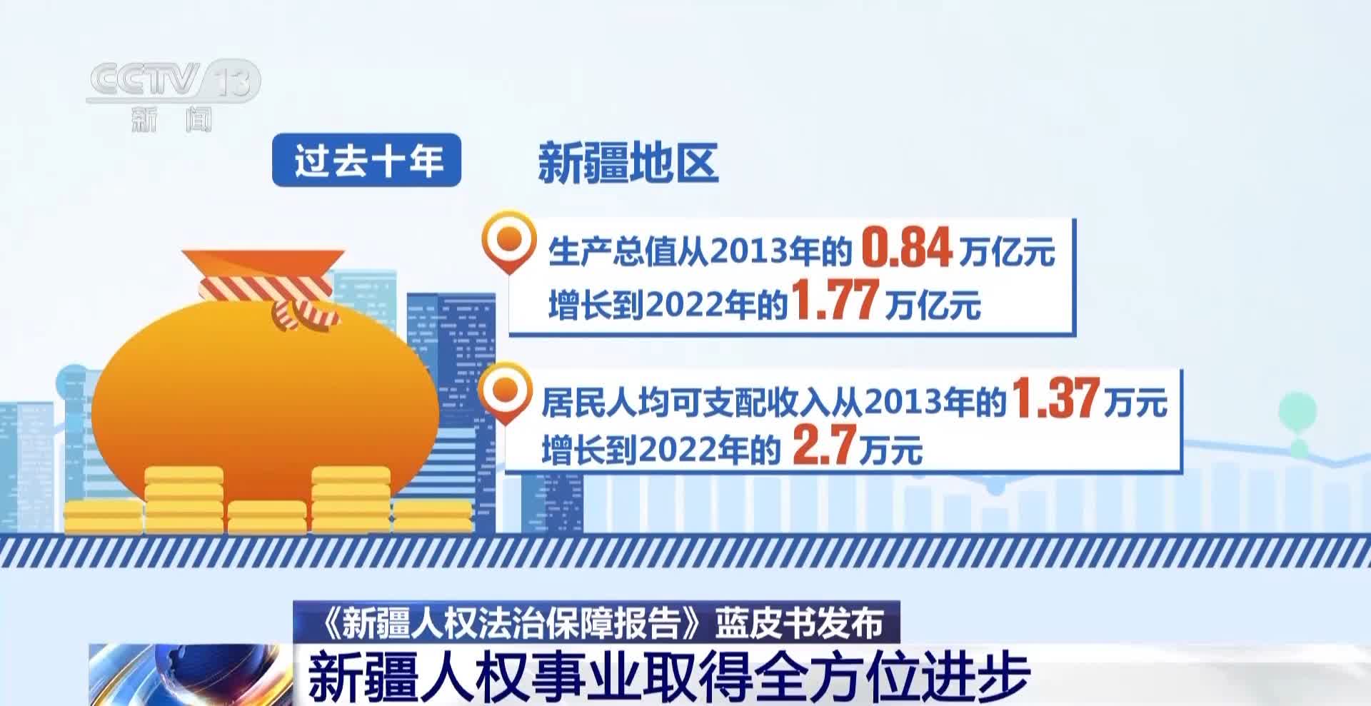 會議期間,還舉行了《新疆人權法治保障報告》藍皮書揭幕儀式。過去十年,新疆地區生產總值從2013年的0.84萬億元增長到2022年的1.77萬億元,居民人均可支配收入從2013年的1.37萬元增長到2022年的2.7萬元。