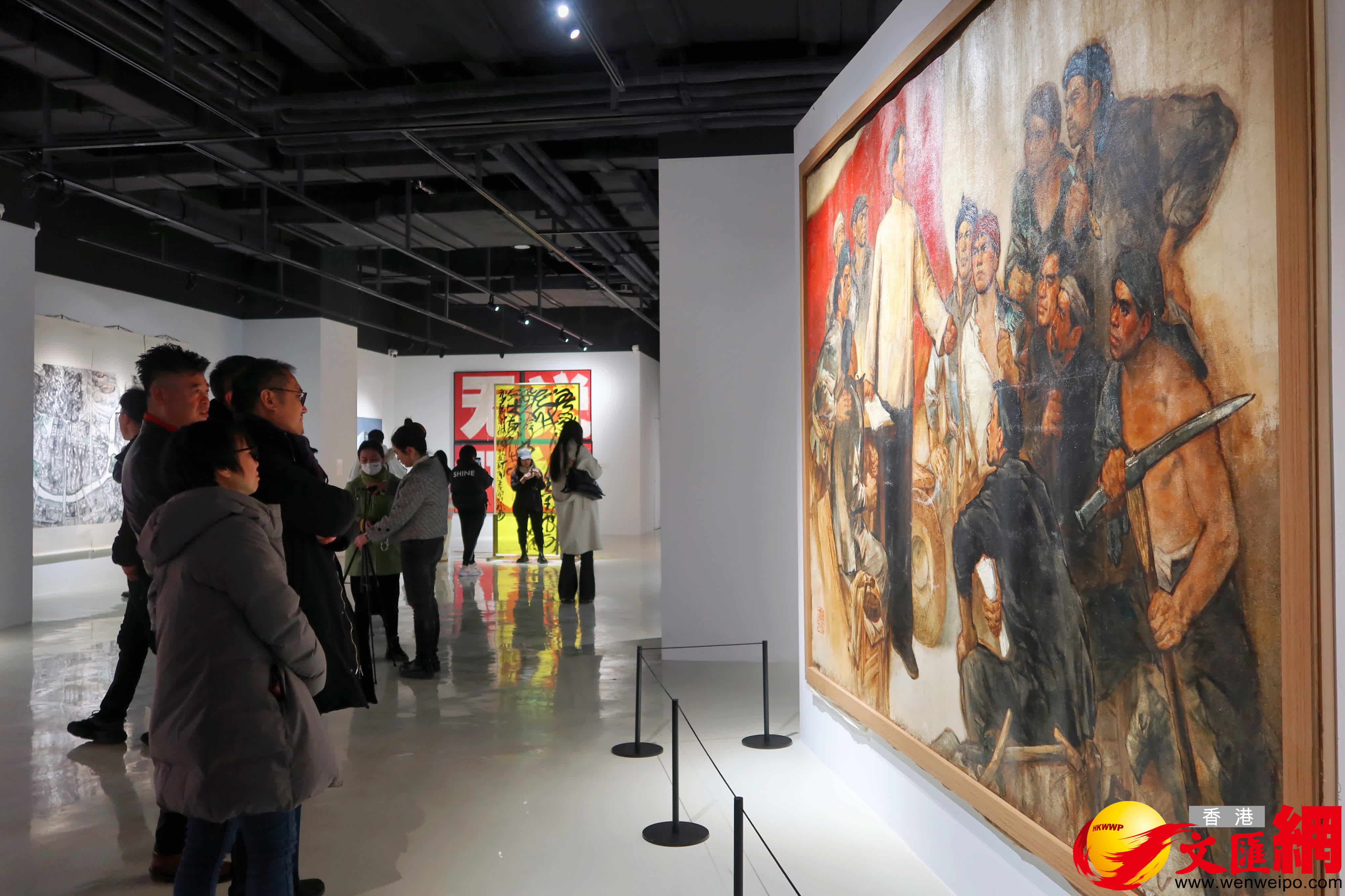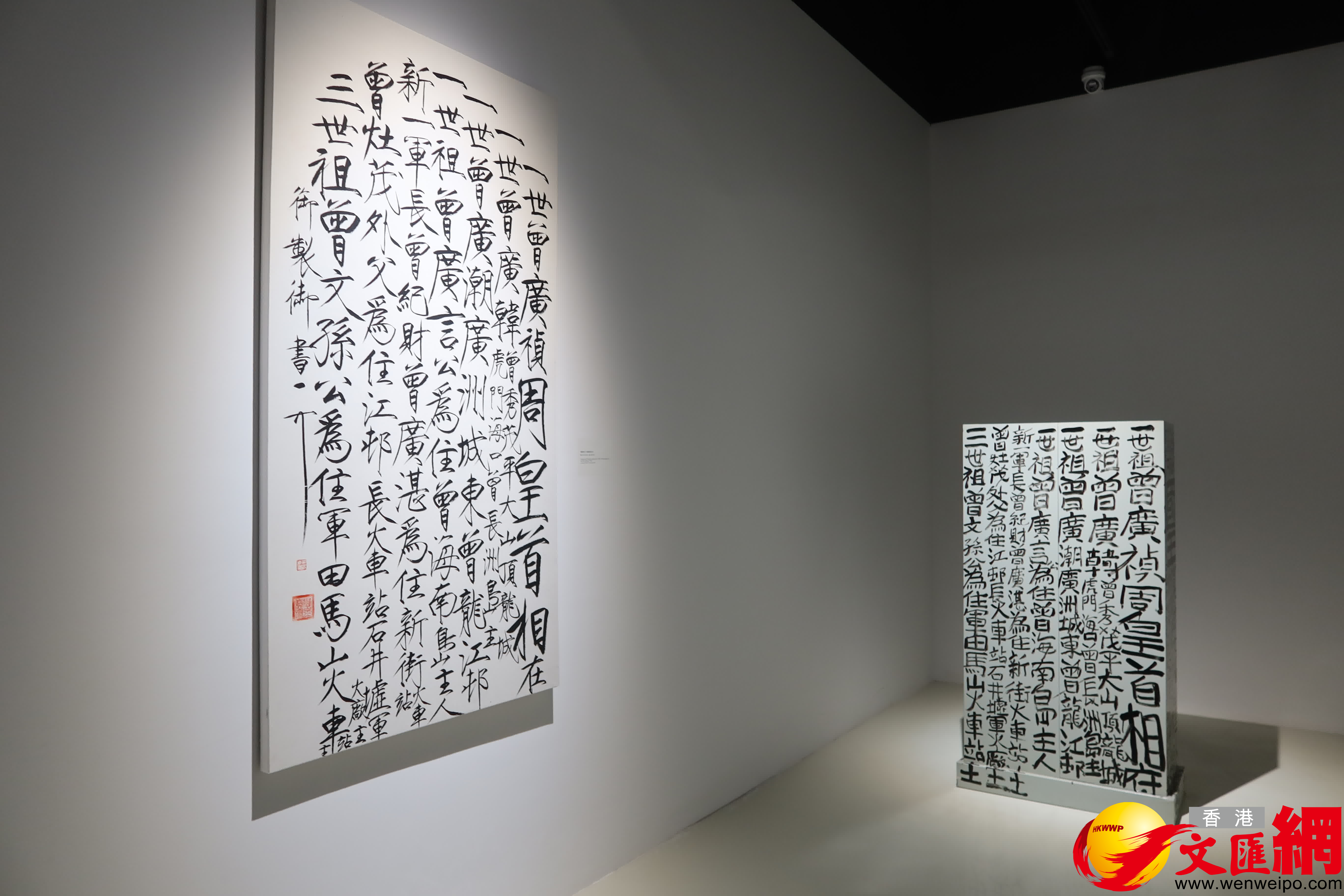 在展覽第一板塊「文字與符號」的一角,香港藝術家曾竈財(九龍皇帝)的作品《花縣曾蓮塘村長》安靜地矗立着,一旁書法家魯大東的《意臨曾竈財的〈周皇首相〉帖》與之相互映照。「曾竈財可以算是香港最早的塗鴉藝術家,魯大東老師在香港採風的時候看到了他的作品,覺得很有趣,就用書法做了一次回應與互動。」中心美術館館長王岩告訴記者,「我們展館裏還有不少來自香港、台灣的藝術家,他們的作品和內地藝術家的作品體現的歷史時間都有一些重疊,我們把這些作品放置在一個空間內,並歸入一個大的主題中,我想這也算是內地與香港、台灣當代藝術在某種形式上的一種交流。」