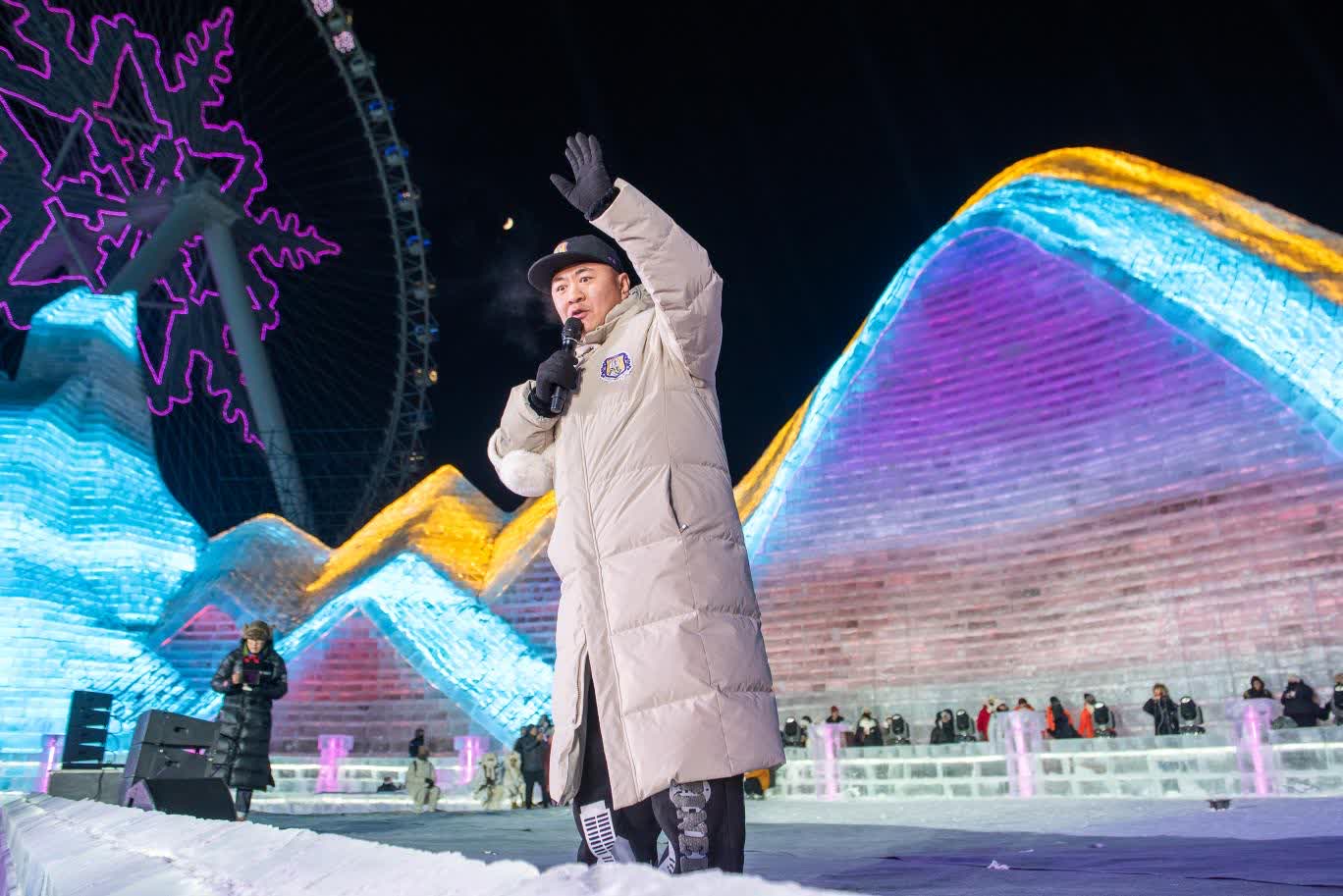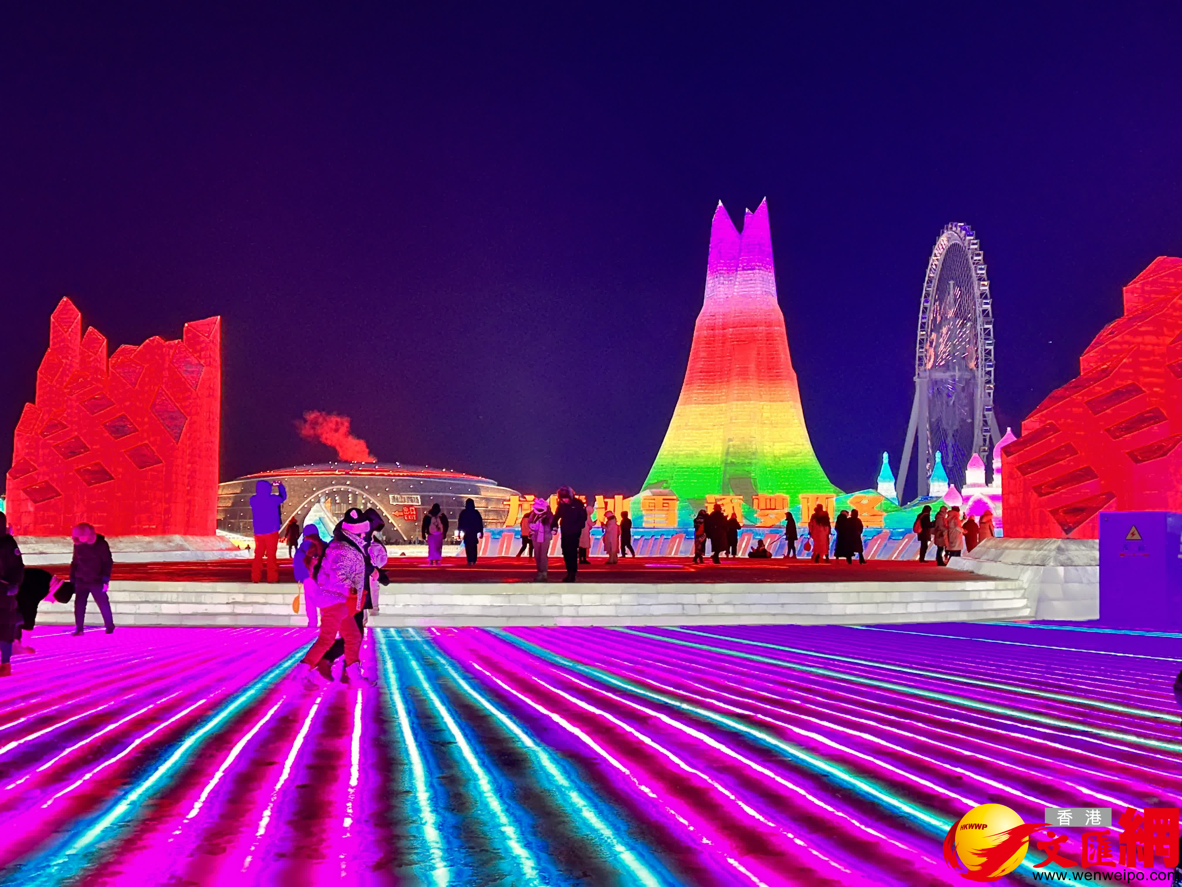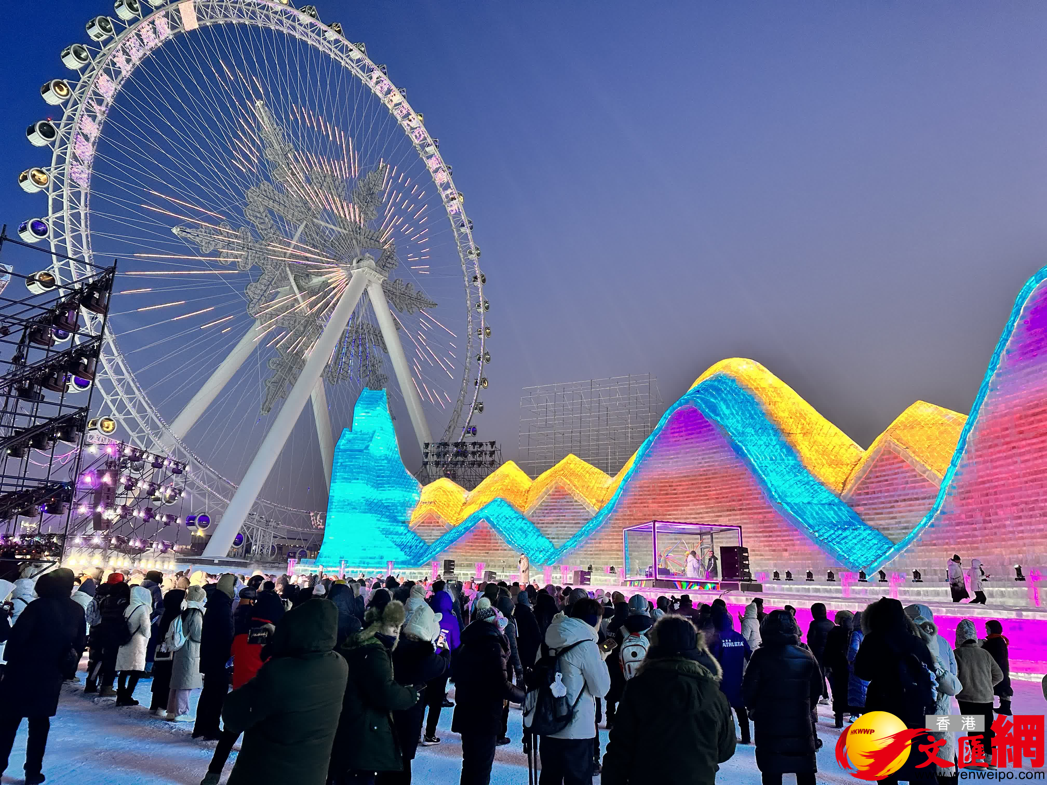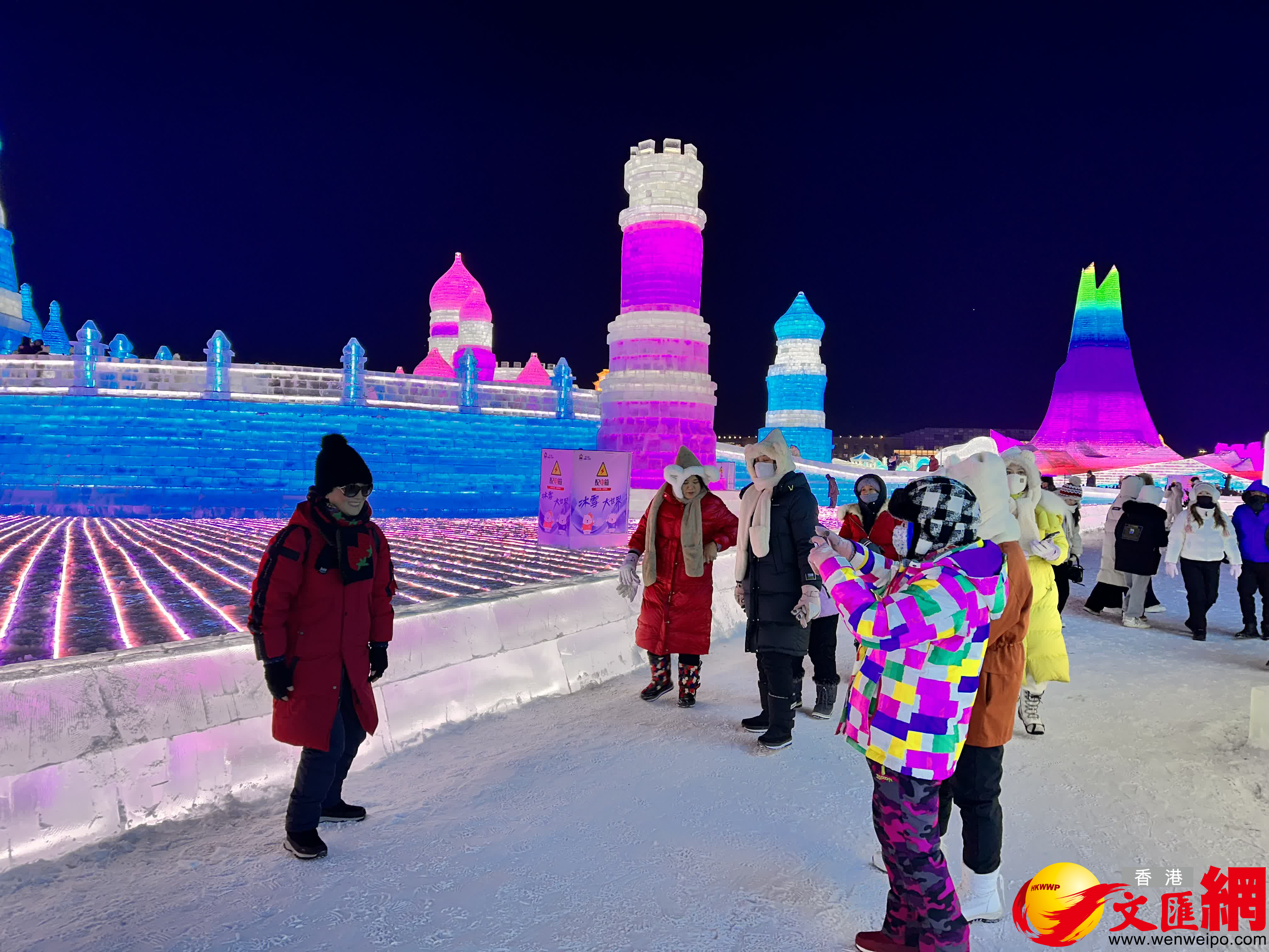 (香港文匯網記者 王欣欣)「左腳,右腳,大家別踏錯……」24日晚,火爆全網的哈爾濱冬天室外演出活動——哈爾濱冰雪大世界夢想大舞台如約開場,伴隨網紅主持人「左右哥」的口號,萬餘國內外遊客雙手搭肩排成長龍,跳起兔子舞,伴隨勁爆音樂在零下二十幾度的室外「蹦迪」,營造了獨特的「冰火兩重天」的熱烈氛圍。