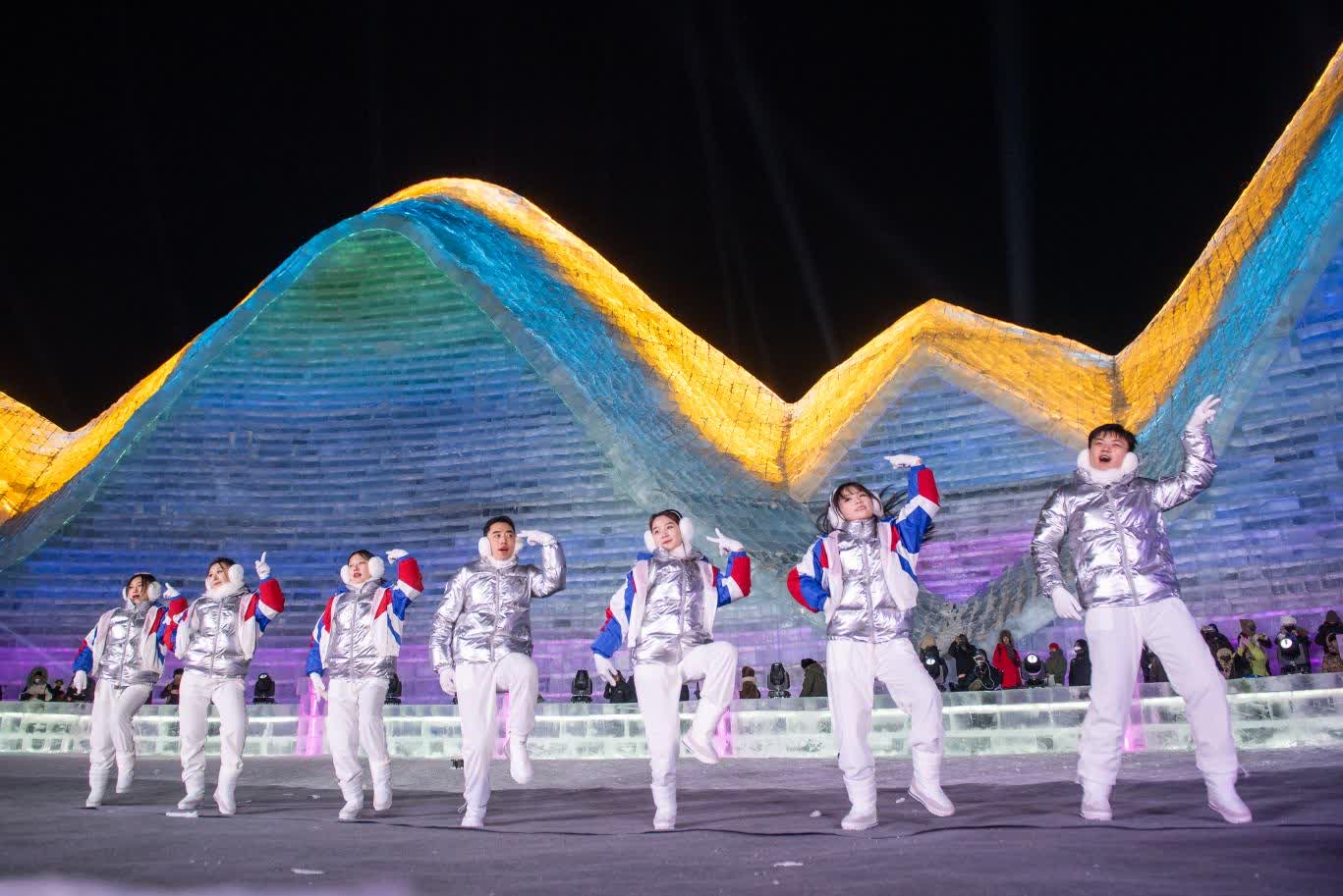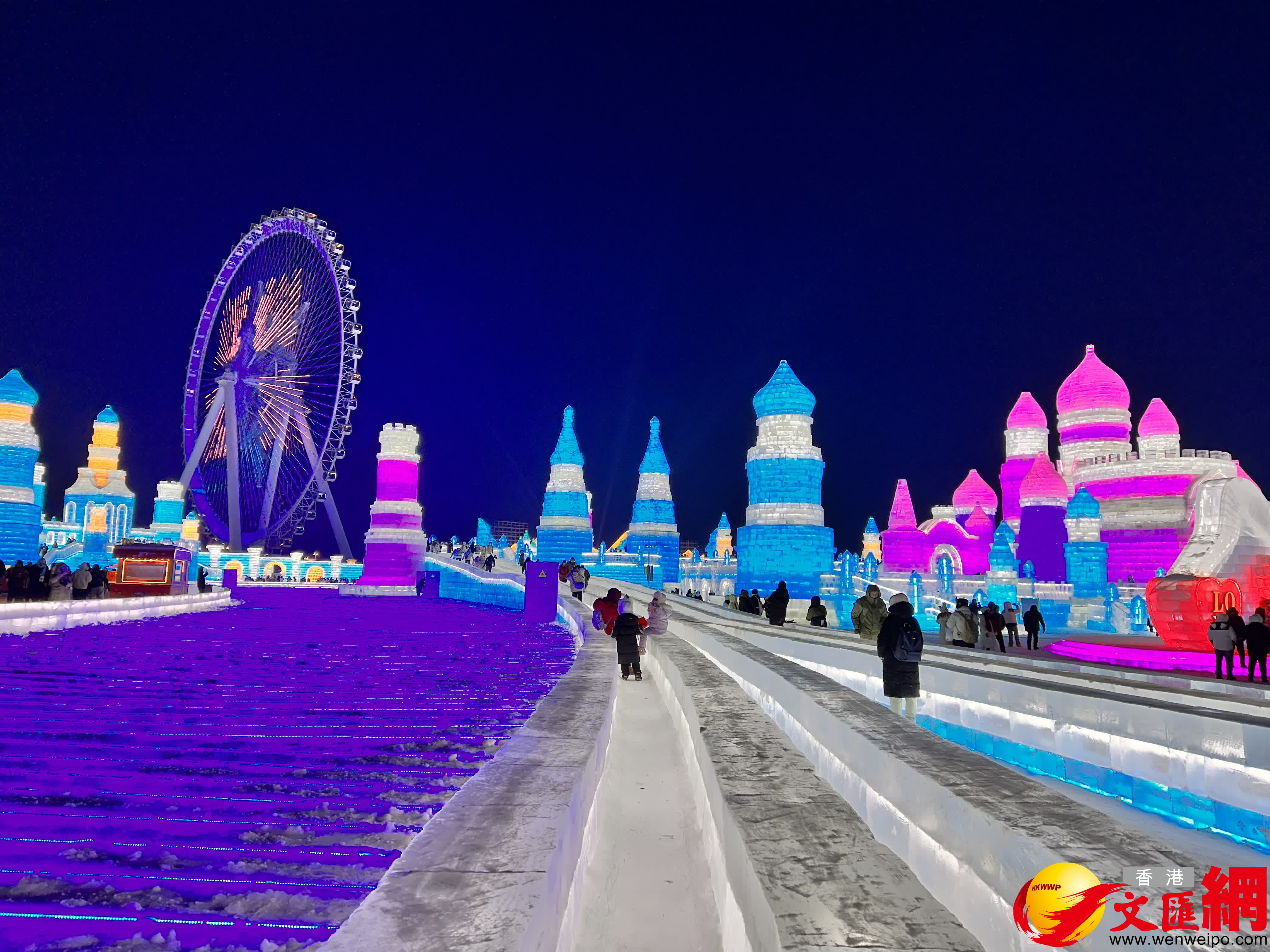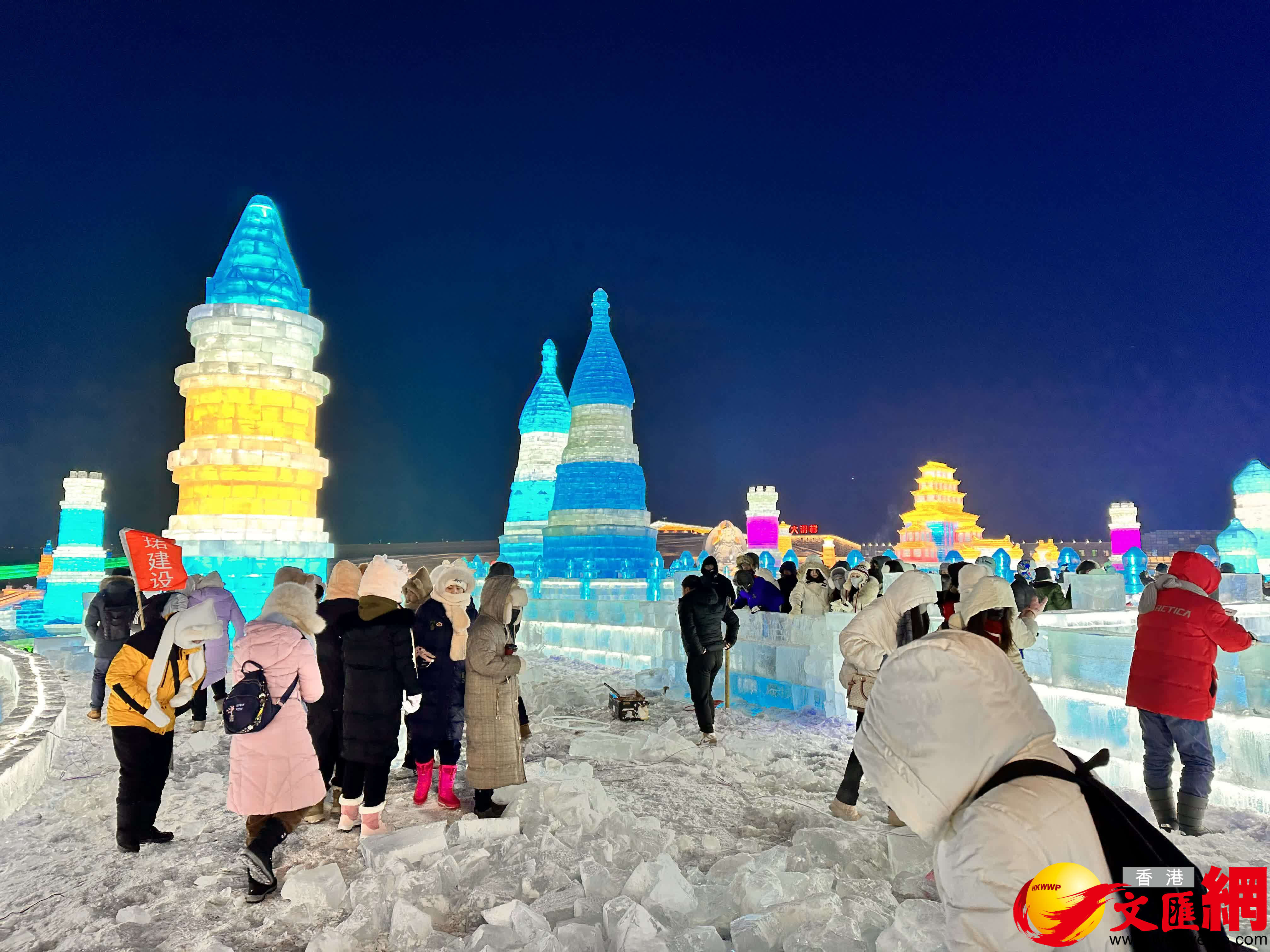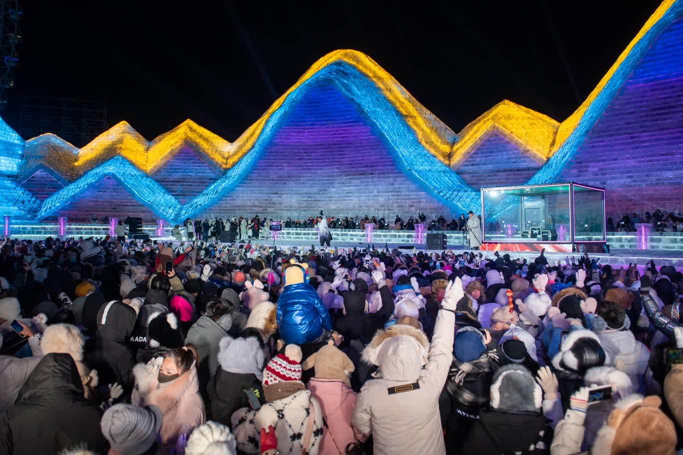 (香港文匯網記者 王欣欣)「左腳,右腳,大家別踏錯……」24日晚,火爆全網的哈爾濱冬天室外演出活動——哈爾濱冰雪大世界夢想大舞台如約開場,伴隨網紅主持人「左右哥」的口號,萬餘國內外遊客雙手搭肩排成長龍,跳起兔子舞,伴隨勁爆音樂在零下二十幾度的室外「蹦迪」,營造了獨特的「冰火兩重天」的熱烈氛圍。