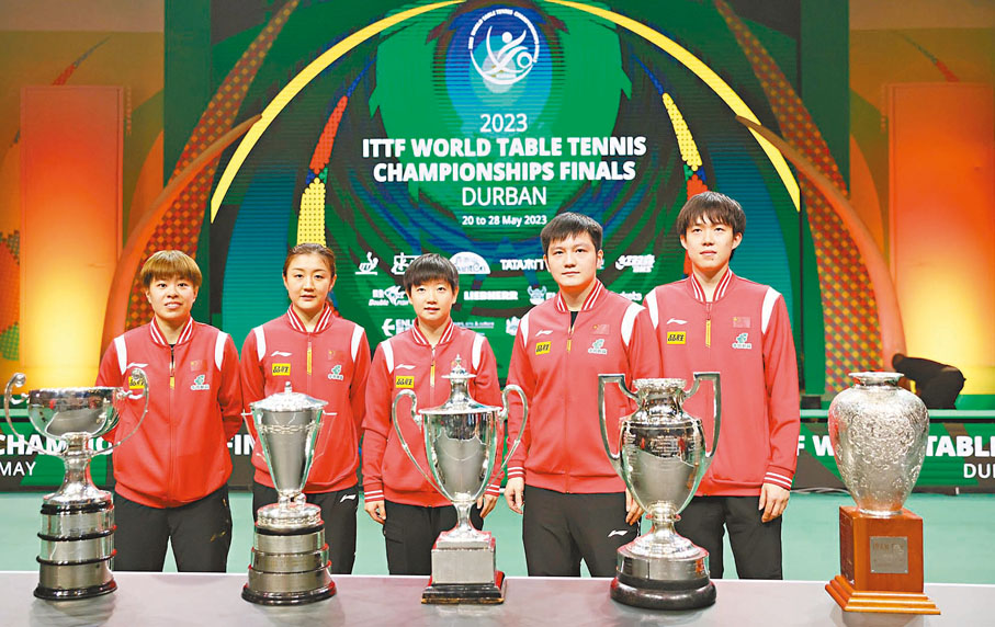 5月20日至28日,世界乒乓球錦標賽在南非德班舉行,中國隊包攬五個單項冠軍,樊振東、孫穎莎分別摘得男、女單打金牌,樊振東/王楚欽為中國隊時隔四年重奪男雙冠軍,陳夢/王藝迪女雙登頂,王楚欽/孫穎莎混雙衛冕;7月,日本福岡舉行的游泳世錦賽上,中國隊以20枚金牌的成績位列金牌榜第一,游泳隊在多個項目上打破紀錄,花游隊獲得3金1銀1銅,其中包括集體技巧自選和混雙自由自選兩枚具有突破性的金牌。