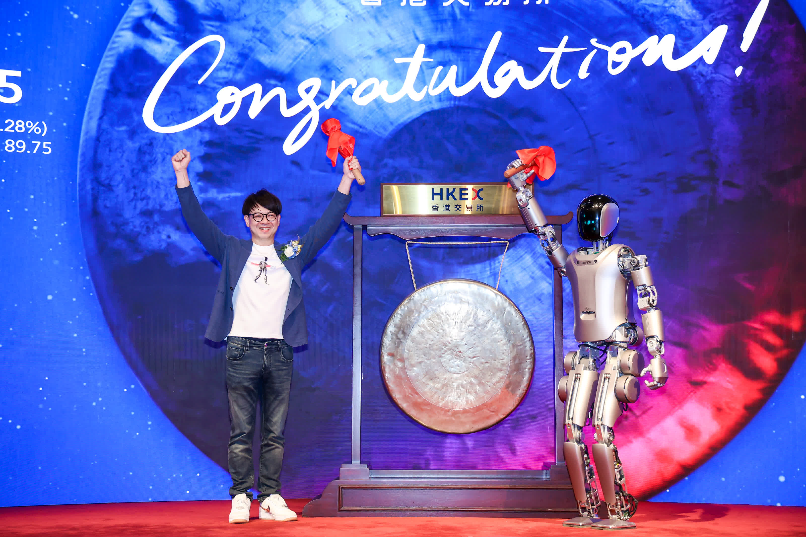 當日,優必選(股份代碼:9880.HK)股價最高達91港元,對應市值約380億港元。香港特區政府創新科技及工業局局長孫東、香港特區政府引進重點企業辦公室執行總裁吳國才,香港聯交所上市委員會主席Renu Bhatia,香港交易所聯席營運總監陳翊庭,優必選董事會主席、執行董事兼行政總裁周劍等出席上市儀式,共同見證人形機器人第一股的正式誕生。