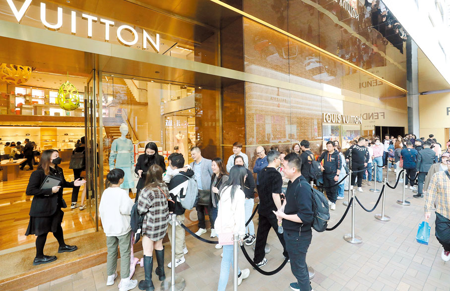 香港文匯報記者昨午到尖沙咀廣東道的「名店街」訪察,只見街上人來人往,驟眼看大多數是內地及外國旅客,因人數眾多,有個別名牌店進行人流管制,客人要在店外輪候分批入場。單是店外人龍持續有幾十人,但為買到心頭好,客人不惜等候半小時以上。