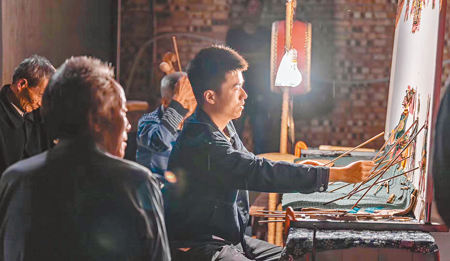 令他沒想到的是,這個決定得到了家人的一致支持。於是,他放棄了企業白領的工作,來到西安市的一個旅遊街區,跟隨爺爺的團隊學習皮影戲。「華縣皮影戲的表演一般由前聲、簽手、上檔、下檔、後槽五個人完成,俗稱『五人忙』。前聲必須要有天賦,我唱不來,就只能學習簽手表演。」