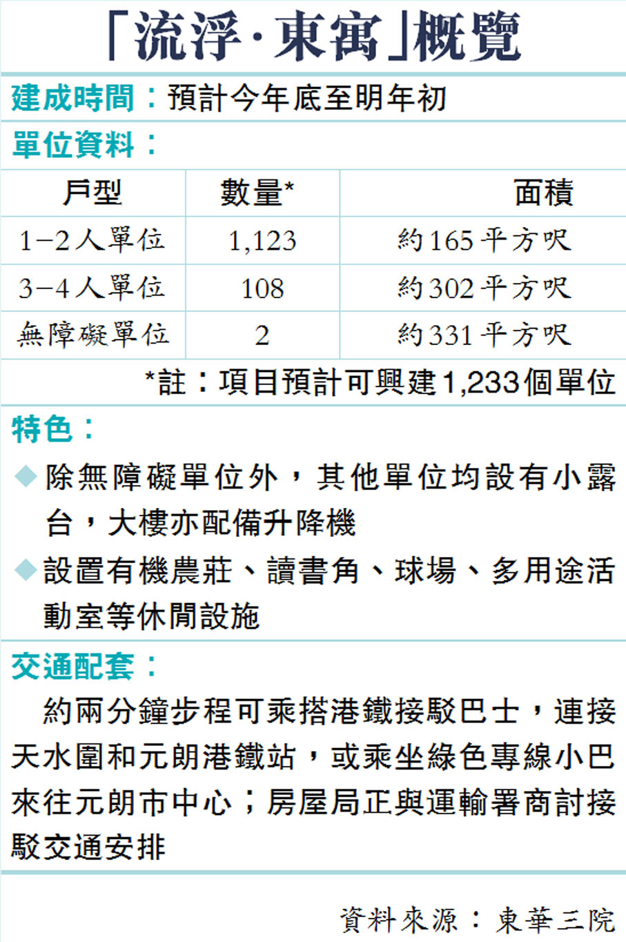 該項目是東華三院承辦的第4個同類項目,將營運5年。東華三院主席韋浩文致辭時指,在符合香港建築規範及可控成本範圍下,「流浮·東寓」增設了小露台和升降機,預計可為近2,800名居民構建方便、舒適和開揚的居住空間。除此之外,社區內亦將設置有機農莊、讀書角、球場、多用途活動室等公共設施,提升住戶生活素質和自我價值。