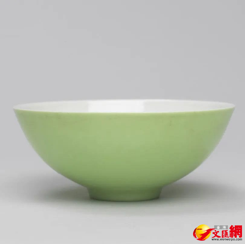 蔥綠釉碗簡介:雍正時期,御窯廠工匠已經成熟掌握了銅、鐵等金屬元素的呈色原理,成功地燒制出各種精美的單色釉瓷器。僅綠釉即可燒制出濃淡不一、各種色階的釉色品種,蔥綠釉即是其中一種。此碗胎薄體輕,色彩柔和淡雅,如春天雨後萌出的嫩芽,嬌嫩欲滴。又如春風拂面而過。其輕盈如鴻毛卻恐春風拂去。俏皮活潑,清新可人。