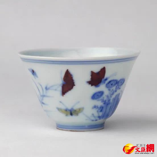 鬥彩三秋杯簡介:鬥彩出現於宣德,盛於成化。成化鬥彩精雅絕倫,「姹紫嫣紅」,爭奇鬥豔。此杯蝶翅上所施紫彩即奼紫彩,色如赤鐵,表面乾澀無光,為成化朝獨有。因其描繪秋天庭院景色,故稱「三秋杯」。