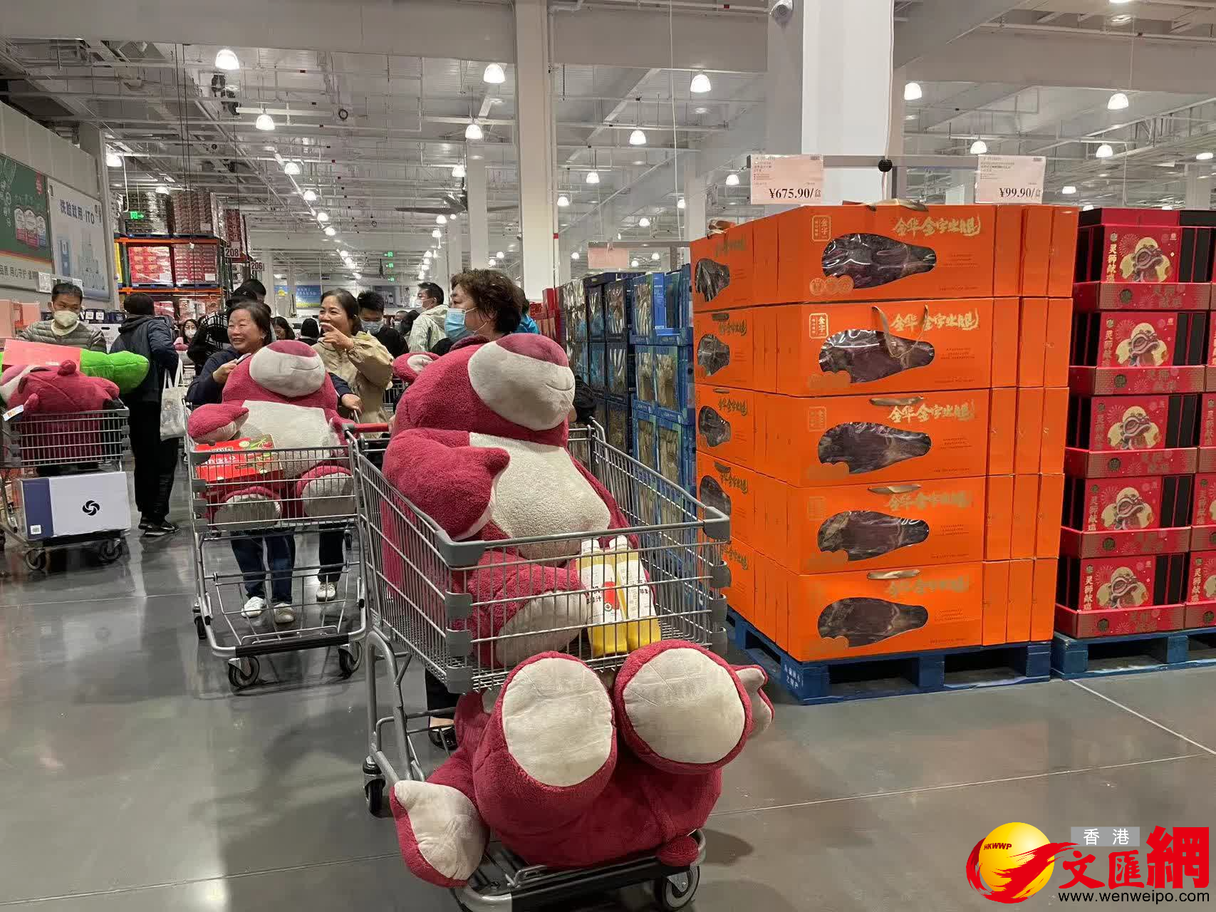 (香港文匯網記者 胡永愛、李薇)在今天(12日)開業的深圳Costco(開市客)現場,記者看到來逛的顧客人手一輛推車,而推車上「草莓+草莓熊」成為人均標配。現場,原價139.9元(人民幣,以下同)的紅顏草莓降價30元,工作人員還未運到擺放處就已經被一搶而空,還有很多顧客原地等待下一波上貨。「1.5千克才109.9元,而且個頭大、紅彤彤的,很新鮮!還有這隻草莓熊玩偶,1.8米的尺寸只要300元出頭,太划算了!」有顧客接受採訪時表示。