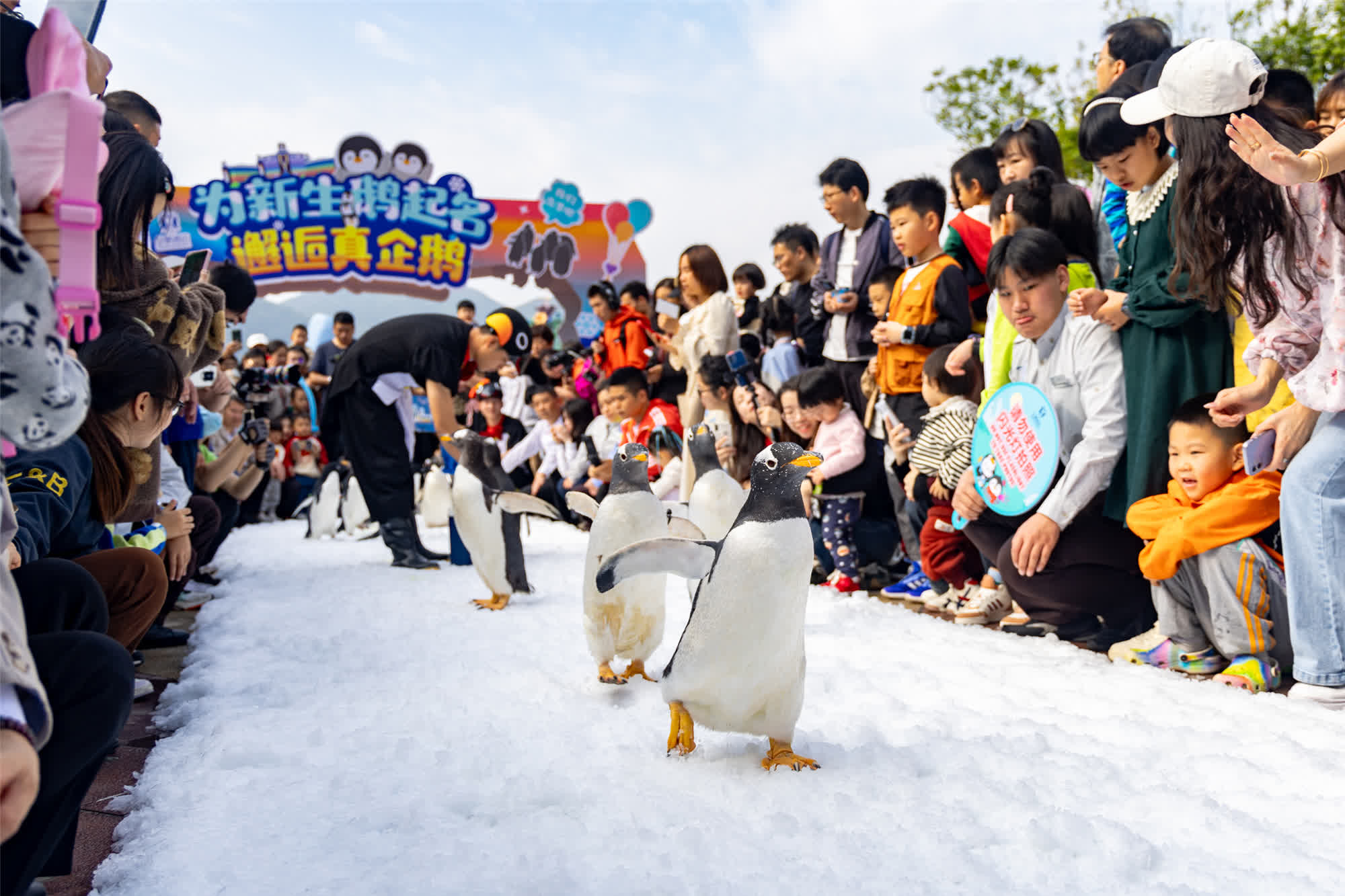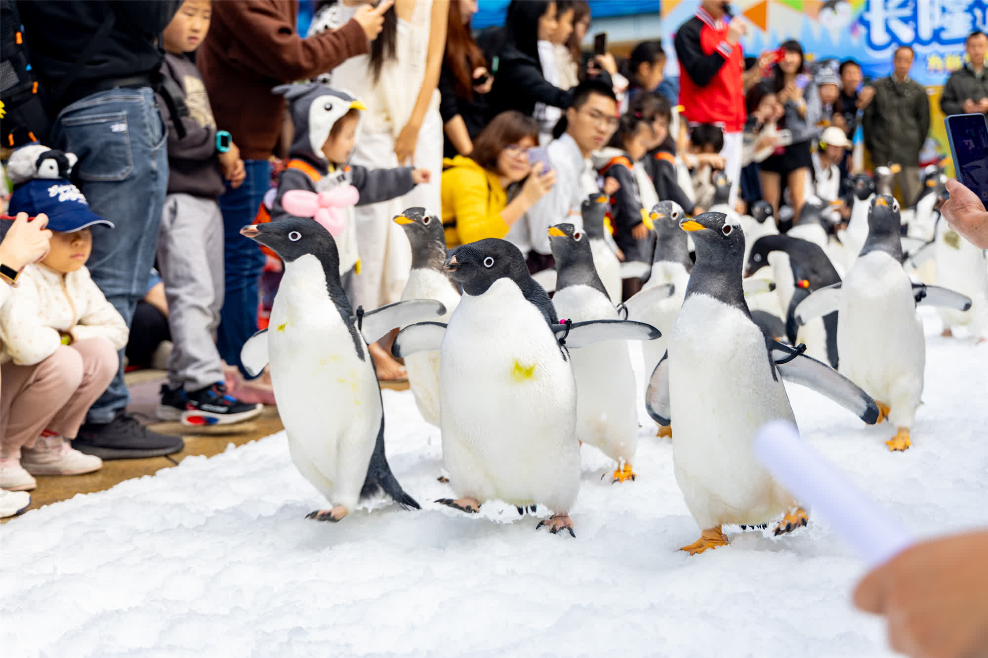 (香港文匯網記者 方俊明)灣區主題樂園珠海長隆目前繁育着地球上最大的帝企鵝展示種群;而去年以來帝企鵝繁育取得新突破,刷新了最低緯度帝企鵝繁育記錄。13日,長隆企鵝酒店舉行帝企鵝「畢業」首展,為「企鵝幼兒園」畢業的四個帝企鵝寶寶公布名字。香港遊客專程北上體驗這一場獨特的南極風情,探索南極生態奧秘。