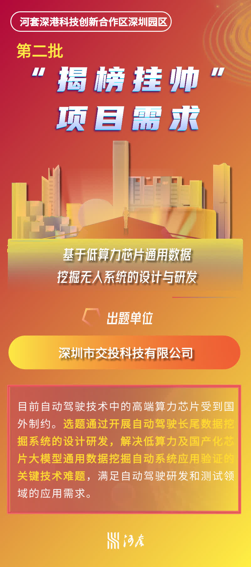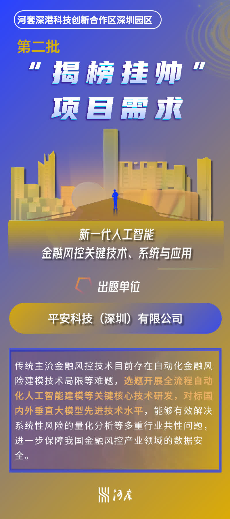 (香港文匯網記者 胡永愛)近日,河套深港科技創新合作區深圳園區(以下簡稱「河套合作區」)面向全球發布第二批「揭榜挂帥」6個項目需求,單個項目最高可獲2000萬資助資金支持。項目聚焦新材料、微電子、大數據及人工智能、醫療科技、金融科技等重點科研領域重大關鍵問題,鼓勵高校、科研院所、研發型企業、科研團隊等主體積聚力量,群策群力,破解難題。
