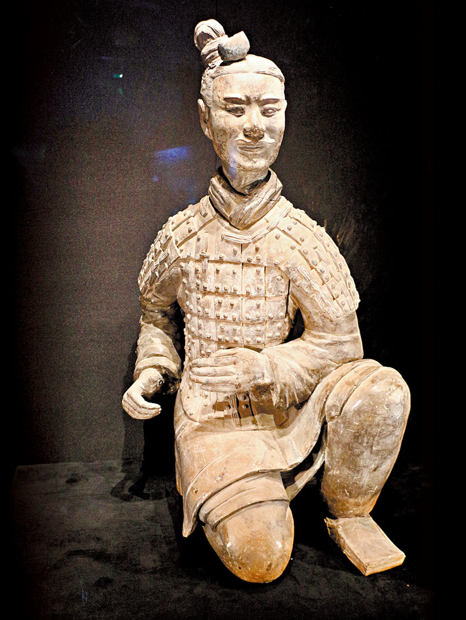 本次展出的一尊秦跪射俑,出土於秦始皇兵馬俑二號坑。跪射俑高1.2米左右,略高於真人蹲曲時的高度,其身穿戰袍,左腿曲蹲,右膝着地,雙目炯炯有神地凝聚前方,雙手置於身體右側作握弓弩待發狀。據介紹,秦代跪射武士俑的塑造比起一般的陶俑要更加精細,對表情神態和髮髻、甲片、履底等的刻畫更加生動傳神,真實表現了當年秦軍作戰時的情景。