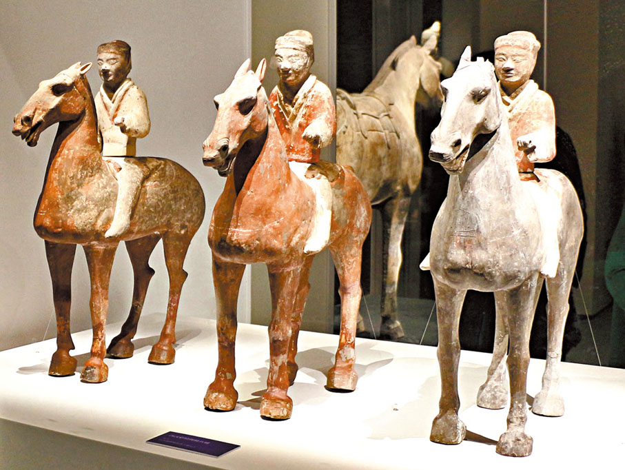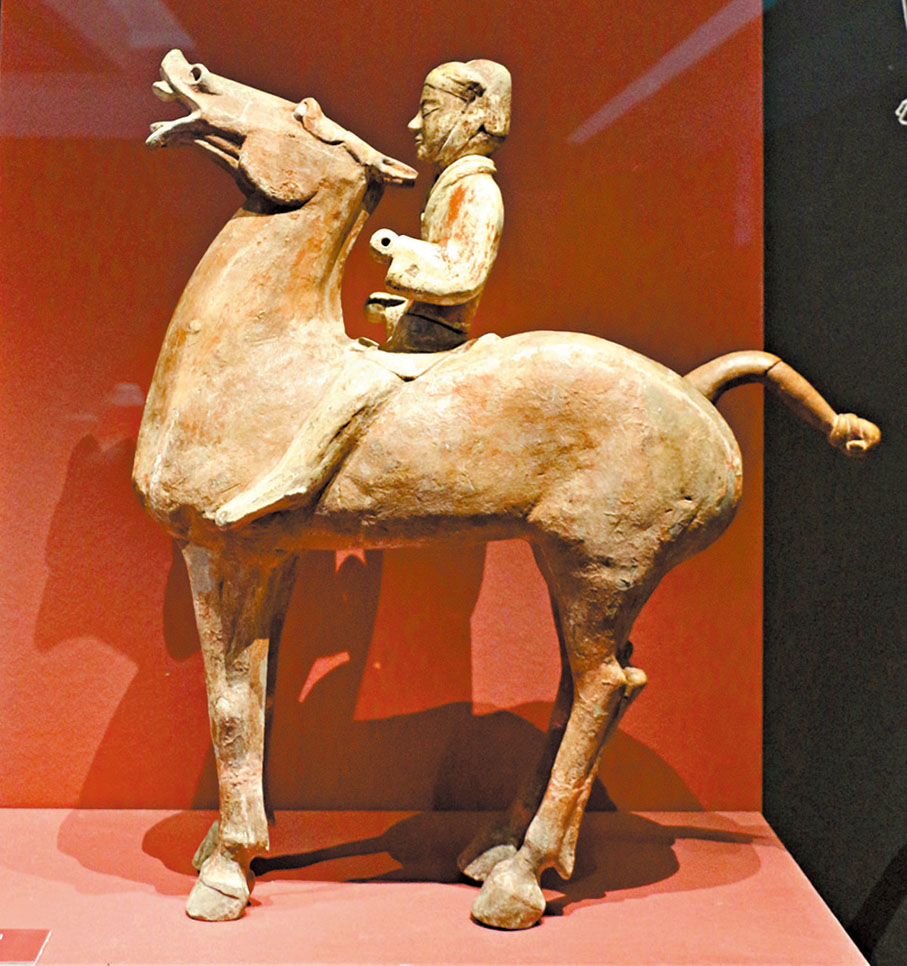 而另一尊出土於陝西咸陽的西漢彩繪陶騎兵俑,通高60餘厘米,騎手頭戴赤幘,上身挺直,右手握拳舉於胸前,左手握拳作持韁狀。身下的戰馬四腿挺立,昂首翹尾作嘶鳴狀,顯示了西漢強大的騎兵力量。此外,現場展出的漢代彩繪跽坐女俑和彩繪女立俑,面龐清秀俊雅、神態安詳、體態端莊大方、衣飾艷麗。特別是跽坐女俑,身體呈漢代宮廷標準坐姿——跽坐姿態,即兩膝着地,臀部壓於腳後跟上,生動再現了王公貴族家中的侍女風貌。