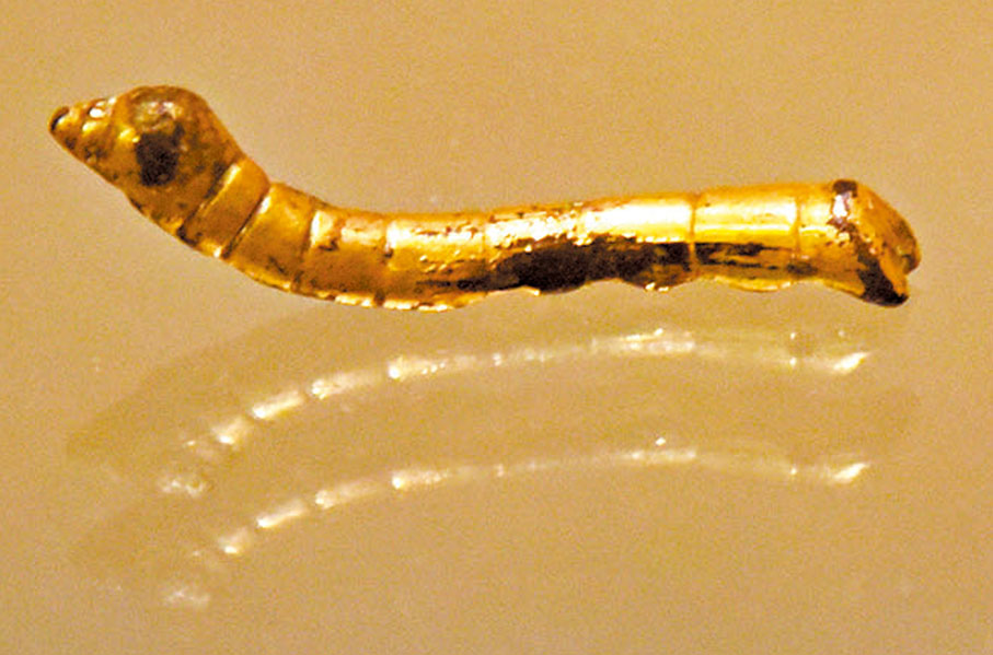 出土於陝西石泉縣的西漢鎏金銅蠶,為內地首次發現的鎏金蠶,其通長5.6厘米,重0.01千克,全身首尾共計九個腹節,呈昂首吐絲狀,刻工精緻。這件文物不僅反映出陝西石泉地區在漢代的養蠶活動已經形成了相當規模,是漢代整個絲綢生產業態的重要見證,同時也反映了絲綢在中國古代中西方貿易中的重要地位。
