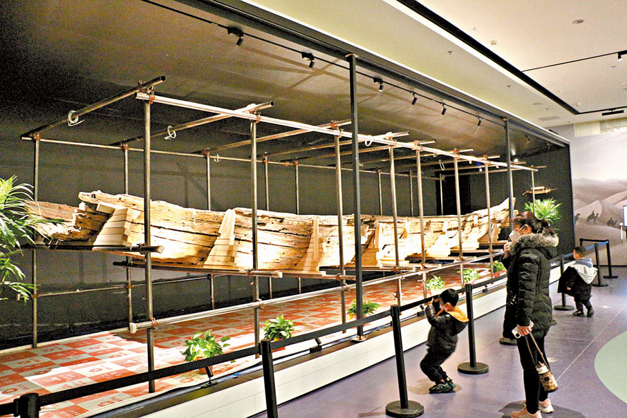 而出土於陝西渭河橋遺址北側岸邊泥沙的漢代木船,長度逾9米,寬近2米,全船由16條船板通過非常複雜的榫卯結構拼接而成。這艘船不僅是陝西考古發現時代最早的一艘漢代木板船,同時其造船技術亦非常獨特,為地中海地區非常流行的工藝。陝西歷史博物館陳列展覽部主任任雪莉表示,該船不僅在中國的造船史上具有重要意義,同時也是對外交流的重要象徵。