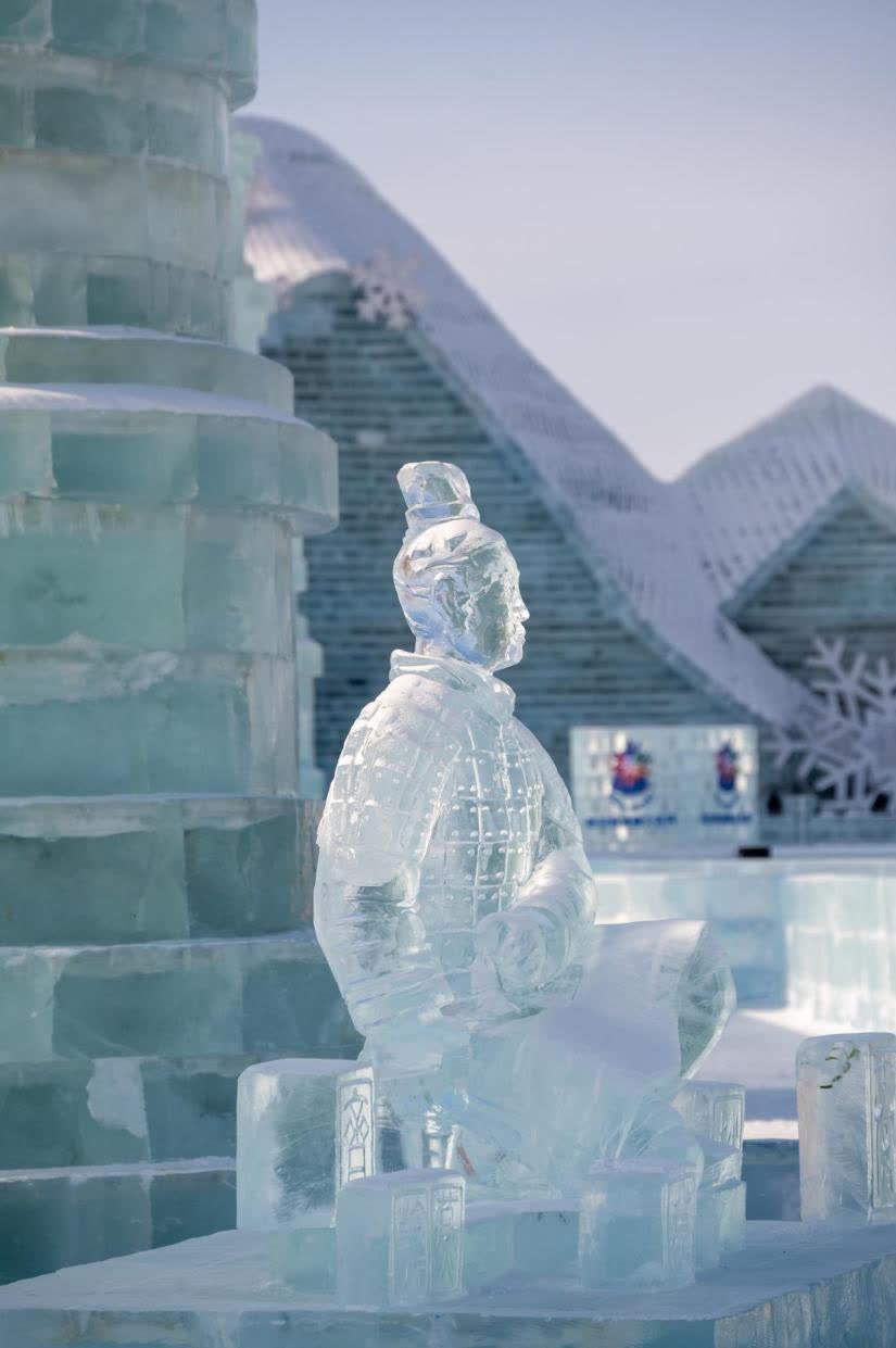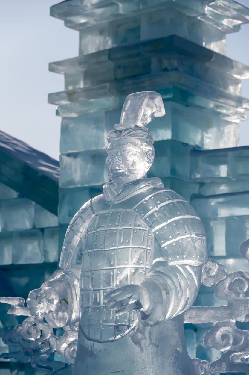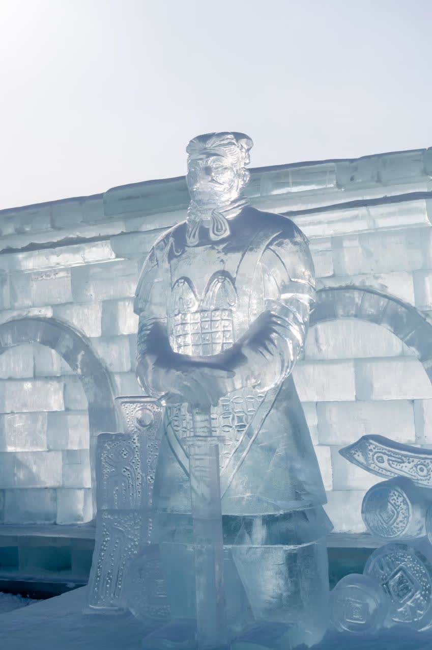 哈爾濱冰雪大世界的冰雕師,運用精湛的冰雪技藝,將古代將士的英勇形象巧妙地刻畫在冰塊之中。這些冰雕作品彷彿帶着歷史的印記,將古代將士的英雄氣概凝固成永恒的瞬間,成為冰雪大世界園區中又一網紅拍照打卡處。