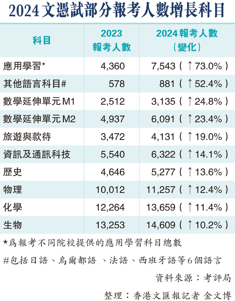 對中六學生而言,將於今年4月開考的香港中學文憑試(DSE)即將進入最後倒數階段。考評局昨日發布2024年DSE的報考統計資料,今年共有約50,800人報考DSE,與去年人數相若。隨着DSE 4個核心科目改革及精簡部分內容,成功為考生釋放空間按個人志願學習更多元化內容,今年DSE有超過四成學校考生報考「4+3」,即4核心科加3個選修科,較去年大增近一倍,有助擴闊知識面。在更靈活選修下,今屆DSE報考乙類應用學習科目大增逾七成,有助其探索職業專才教育的路向,而選修數學延伸單元、物理、化學、生物等數理科目的學生亦同樣大增,為香港儲備創科人才奠基。◆香港文匯報記者 金文博