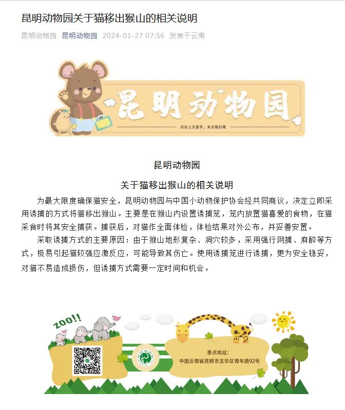 近期,昆明動物園猴山內2只貓疑似被猴群欺負的視頻在網絡傳播並引發關注,許多網友十分關切小貓健康狀況。昆明動物園官方微信公眾號27日回應表示,為最大限度確保貓安全,昆明動物園與中國小動物保護協會經共同商議,決定立即採用誘捕的方式將貓移出猴山。主要是在猴山內設置誘捕籠,籠內放置貓喜愛的食物,在貓採食時將其安全捕獲。捕獲後,對貓作全面體檢,體檢結果對外公布,並妥善安置。