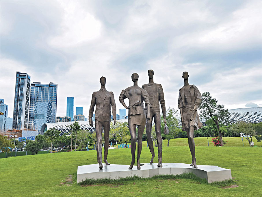 雲水台亦稱百傑山、智慧山,是公園東北部的一塊高地,匯集了愛因斯坦、牛頓、蔡倫、鄧稼先等古今中外著名科學家的肖像雕塑。南區湖岸線的雕塑則以抽象作品為主,表現深圳作為創科創意之都的獨特魅力。在這眾多雕塑作品中,北區雕塑園中心草坪的凸起處,一座名叫《來了就是深圳人》的作品格外引人注目。那是當代雕塑大師李象群先生2018年創作的一組群雕,以鑄銅和白鋼為材質,塑造了4個青春勃發的形象。他們邁着矯健的步伐向我們走來,以都市城廓為背景,模糊的五官突出了頎長的身姿和自信的神態,有一種頂天立地的氣派噴薄而出。