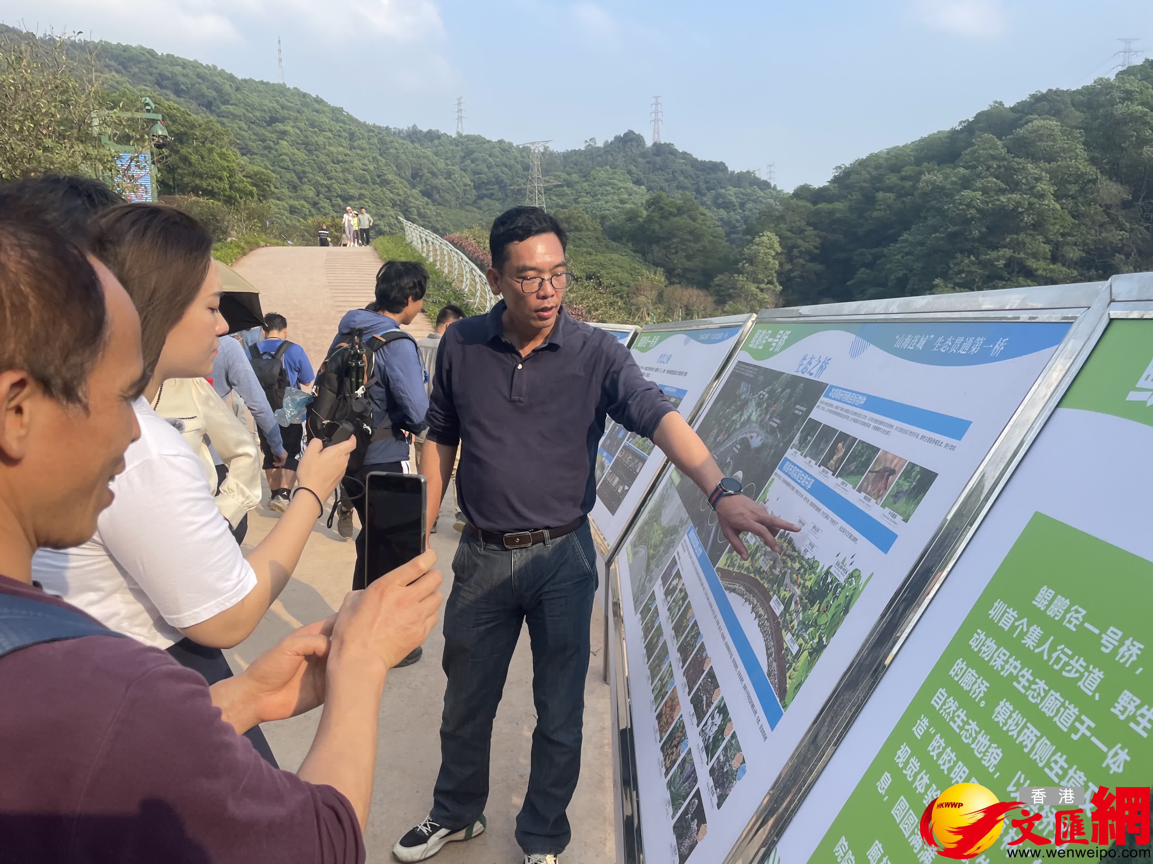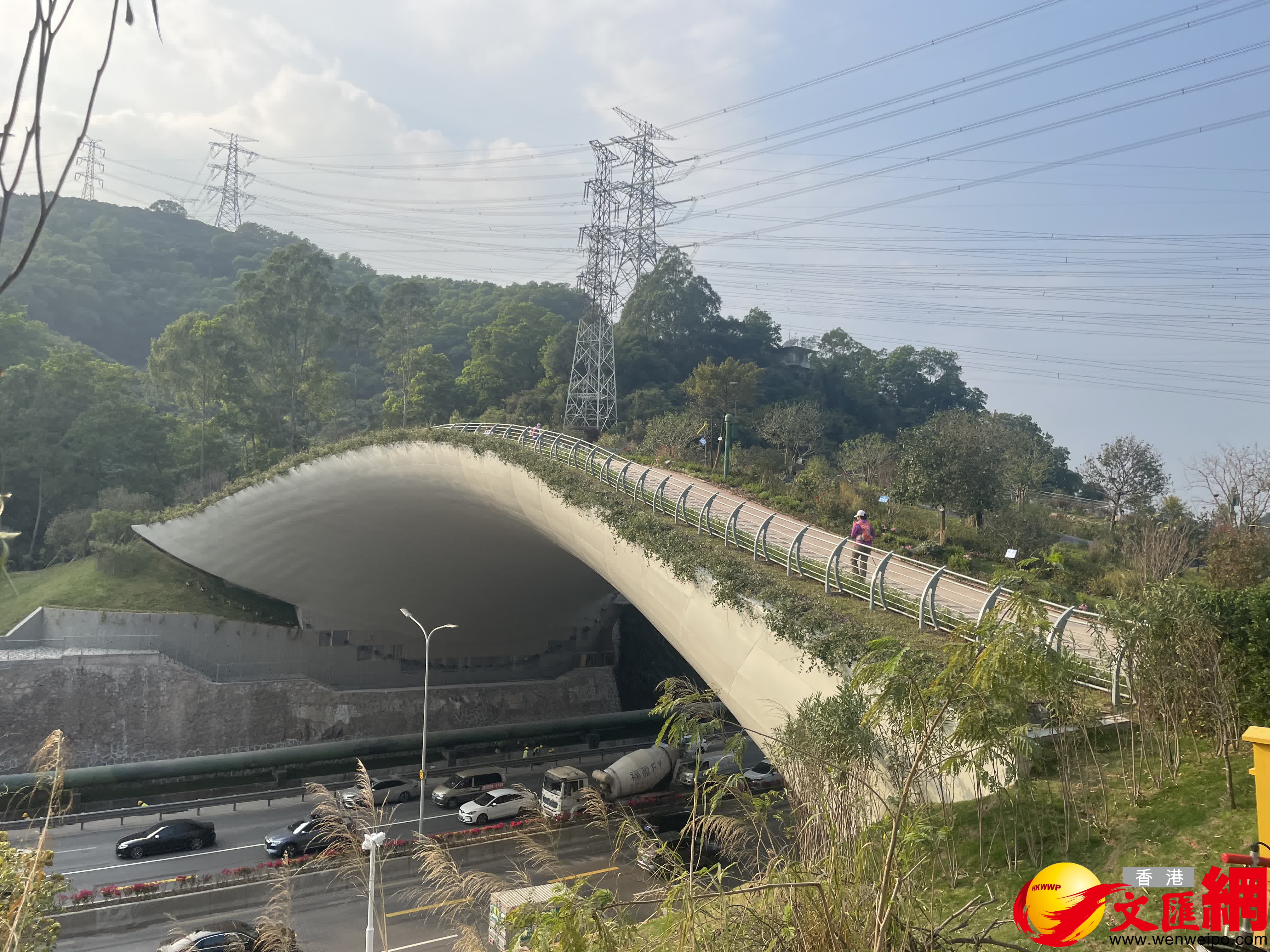 「聽說徒步愛好者以前只能走地下的洞過去,環境很惡劣,還可能有毒蛇。」曾小妹在現場看到,鯤鵬徑一號貫通了梅林山、銀湖山後,眾多戶外徒步愛好者從這裏穿越過去,非常興奮地在橋上拍照打卡。「這座橋是國內首座兼顧人行步道和獨立生態廊道的廊橋。橋上鋪了一些石頭,是考慮豹貓喜歡躲在石頭下面;特別選擇了花香類、漿果類的植物,都是小動物喜愛的『口糧』;橋上還做了一些砌石的通道,方便鳥類滑行。」深圳特區建工梅林生態廊橋總負責人韋彬介紹說。