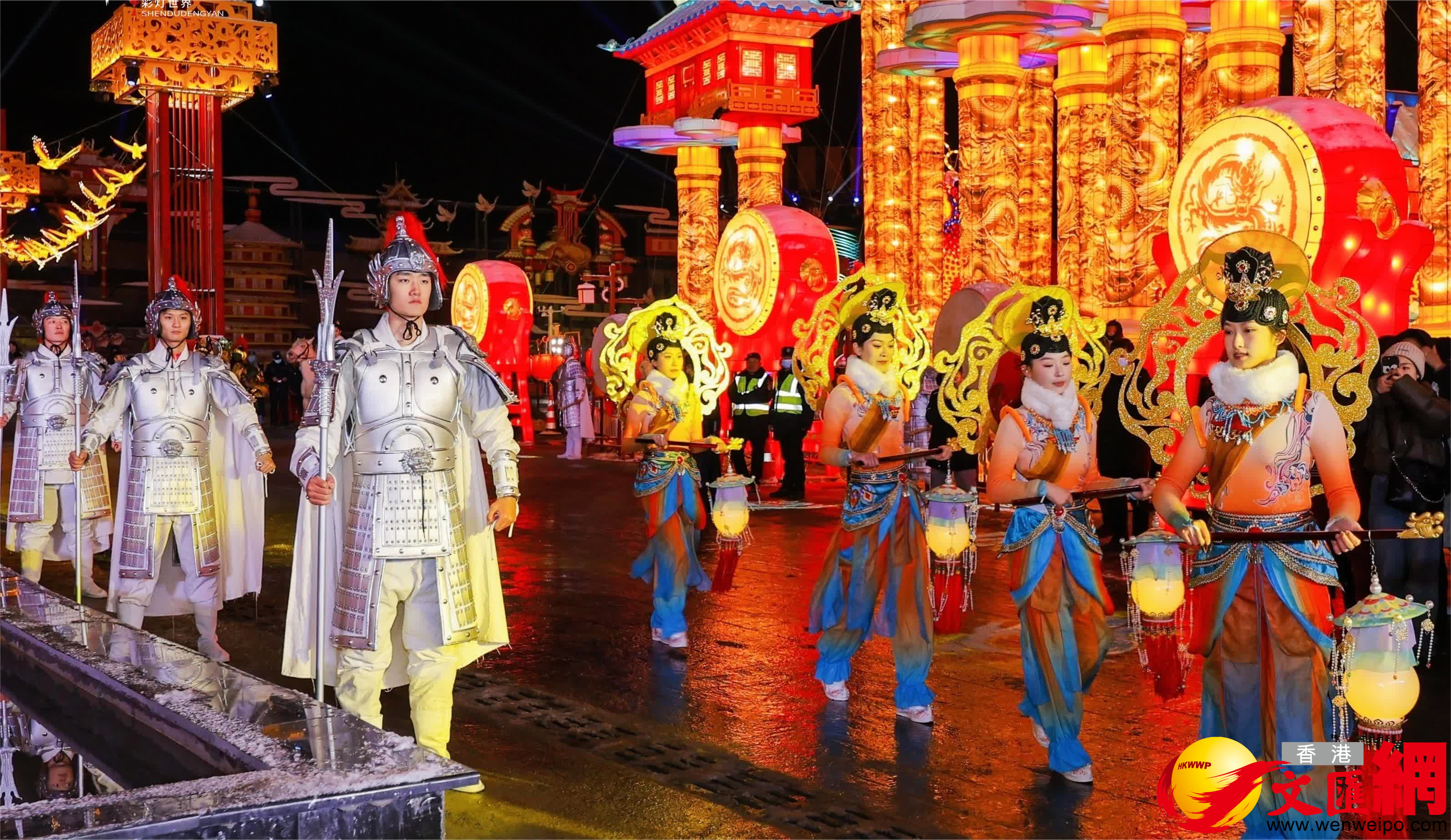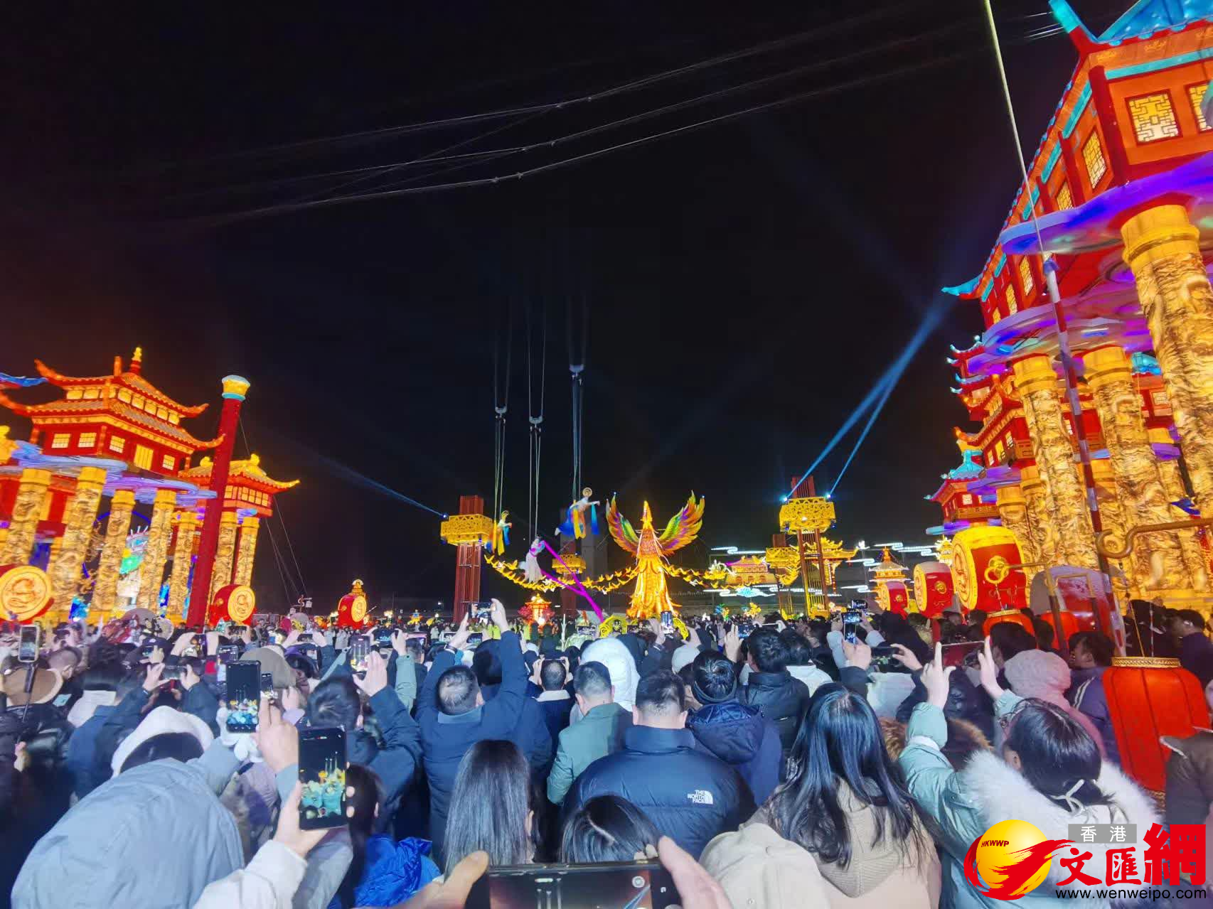 高20餘米,寬達60米的《華夏鎏光門》以恢弘壯麗的氣勢迎接全國遊客,在白雪的襯托下,金黃色宮燈顯得格外流光溢彩,胭脂色的牡丹花燈傲雪怒放,分外妖嬈;走過由高聳的華表柱、高懸天際的天宮建築群、祥雲、鼓廊圍繞的《神都迎賓路》,遊客們將來到《百鳥朝鳳》核心景觀區。