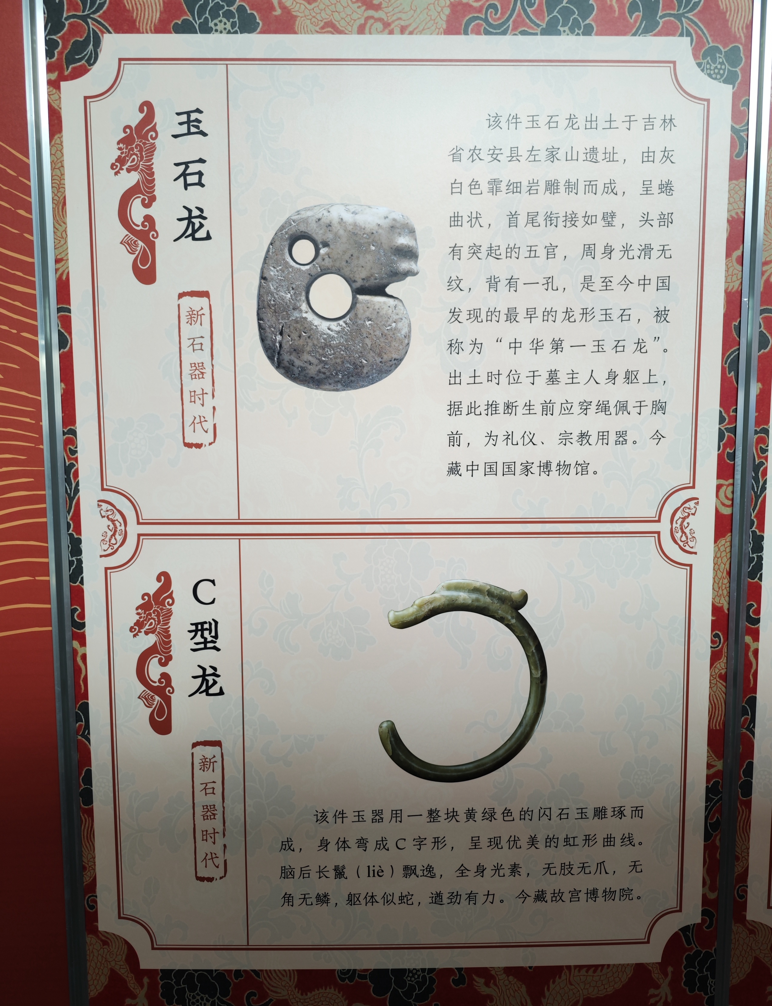 「龍之形貌」介紹了龍的身影在各個歷史時期的不同特性,通過圖文形式展示新石器時代玉石龍、夏時期綠松石龍形器、商時期虎頭龍身像、春秋時期的龍耳簋、漢時期青龍瓦當、東晉時期《洛神賦圖》、唐時期銅坐龍、元時期景德鎮窯藍釉白龍紋盤、明時期孫玉泉千鐙寸玉龍紋墨等出土文物、生活用品和字畫,直觀體現不同時期龍之形貌的區別。