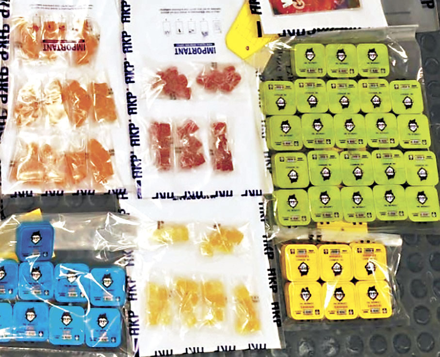將軍澳反三合會行動組早前根據情報分析及深入調查,前日下午掩至沙頭角山咀村以涉嫌販毒罪拘捕一名姓陳(31歲)男子,在其私家車及位於上水的住所,合共檢獲263包共重約3.17公斤的大麻花和其他大麻相關毒品,包括約364克大麻糖、37支大麻油、28支含大麻油的電子煙、小量毒郵票,以及電子磅、真空包裝機等包裝工具。毒品總值約76萬元。