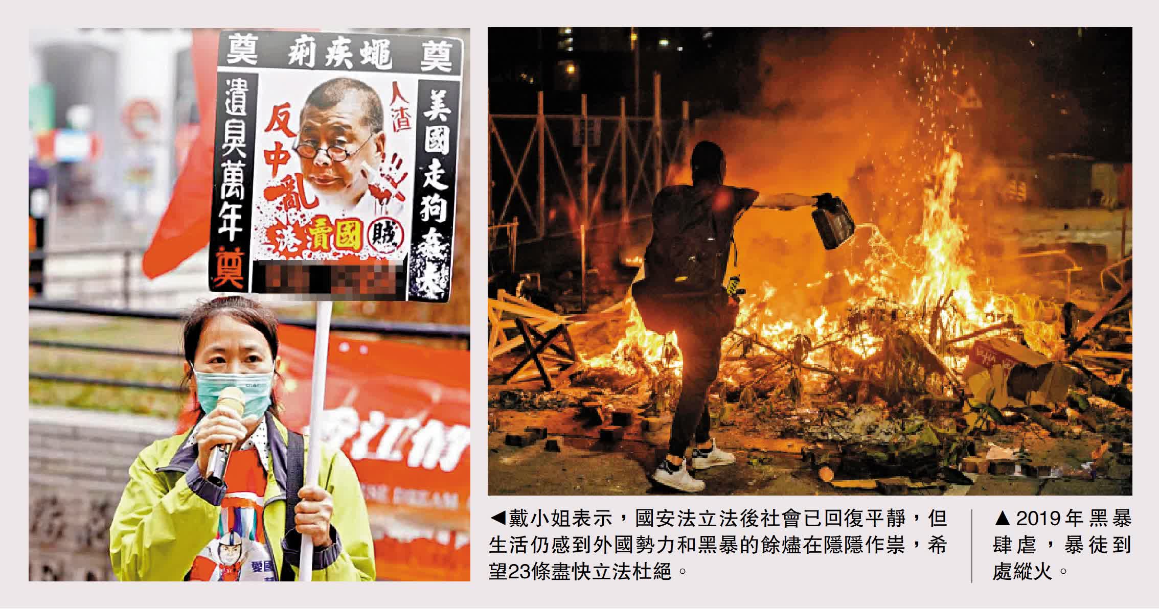 但她又發現,一些與外國勢力干預及暴亂相關的餘燼,仍在社會暗處,以及市民生活中隱隱作祟。像一些小型網媒仍在有意無意轉發暴亂時的信息,街上仍久不久看到一些與暴亂相關的標語塗鴉,甚或一些小店內仍保留着一些暴亂時候的意識,像標語、圖案等。「這些危害國家和社會安全的東西,不能移到地下就可以繼續存活,正常的香港市民根本不想再看到這些事物。」戴小姐認為,23條立法後,一切與外國勾結的行為就能進一步杜絕,香港也能夠主動出擊去干預這些行為,是越早實施越好,必須施行的條例。