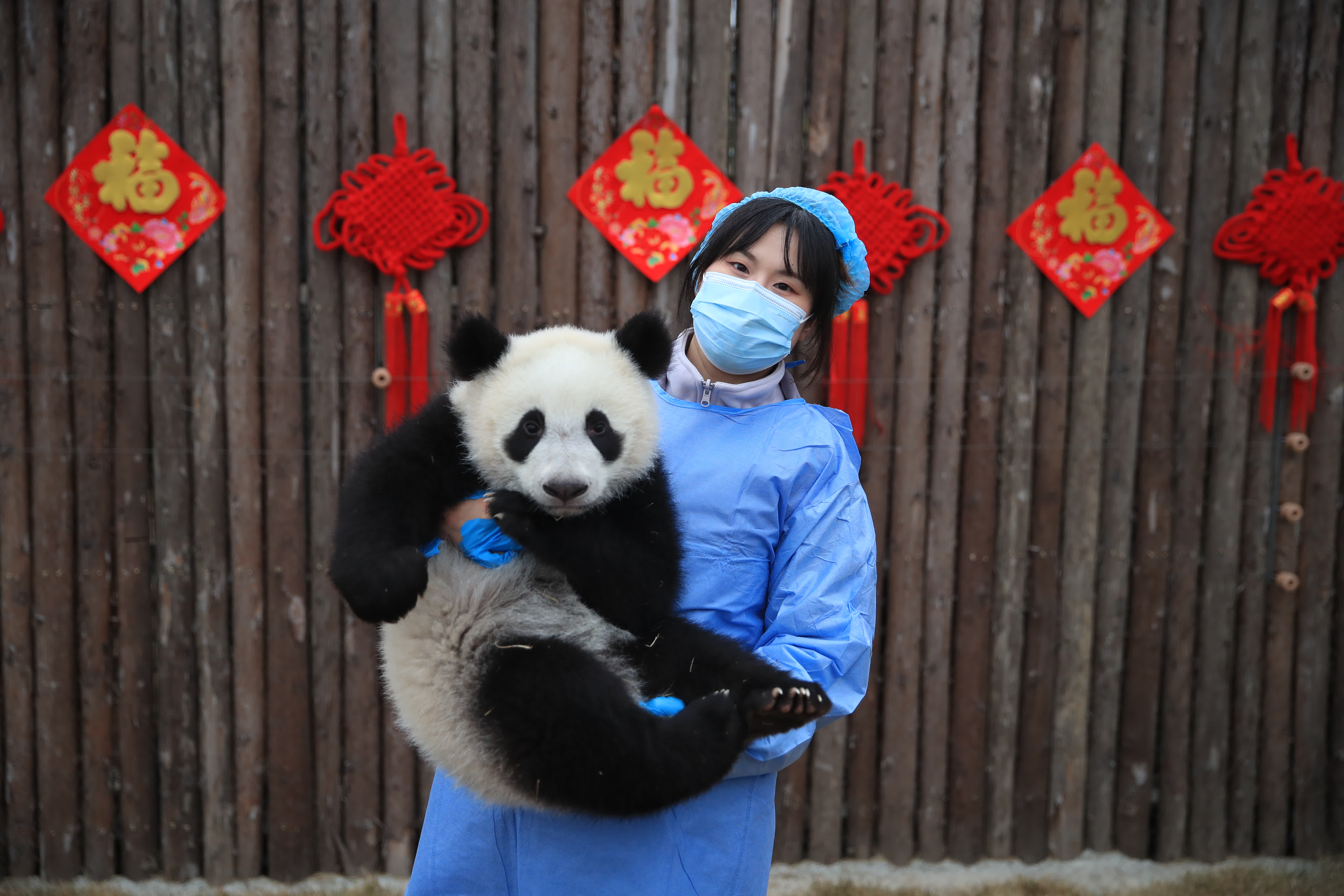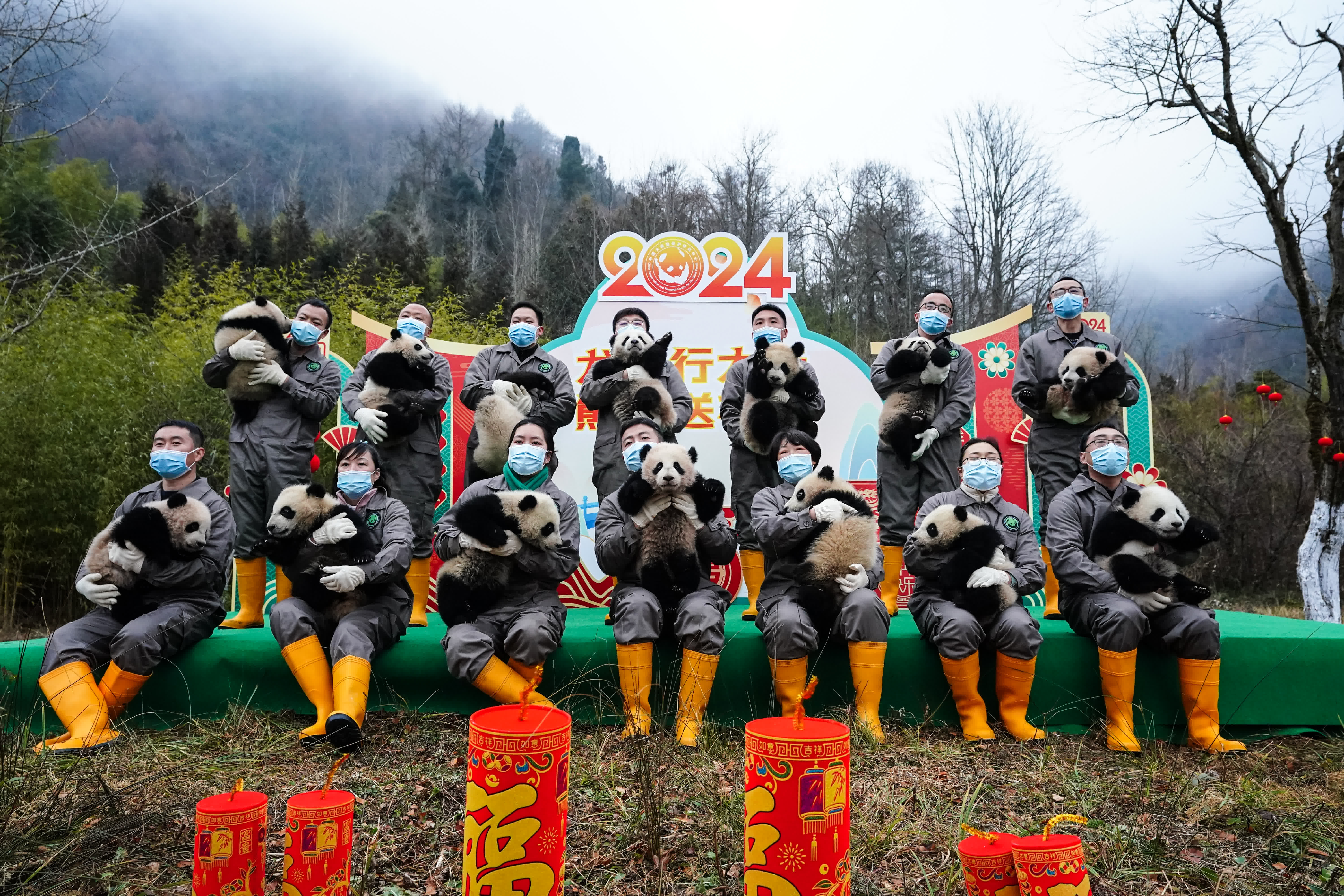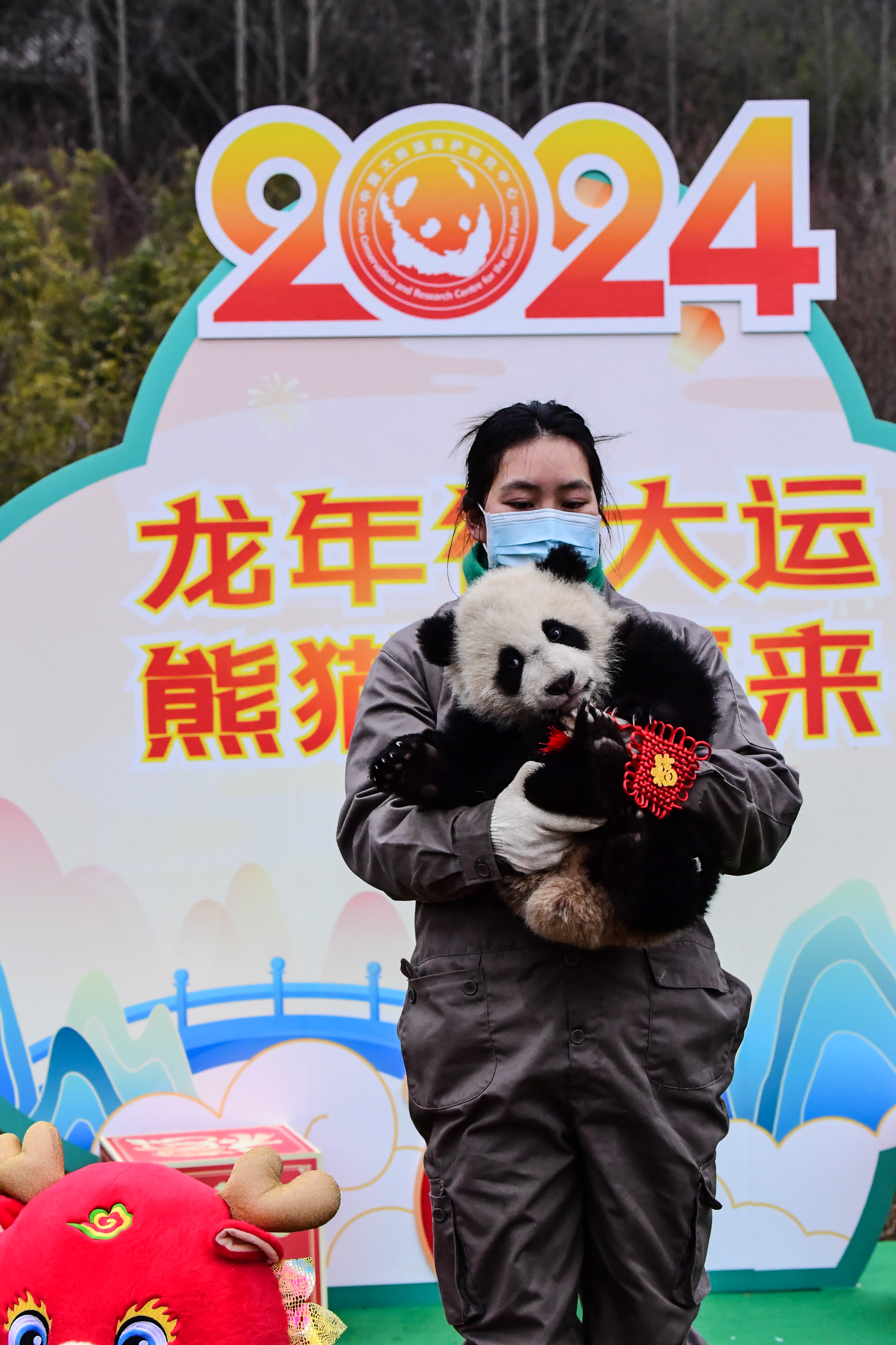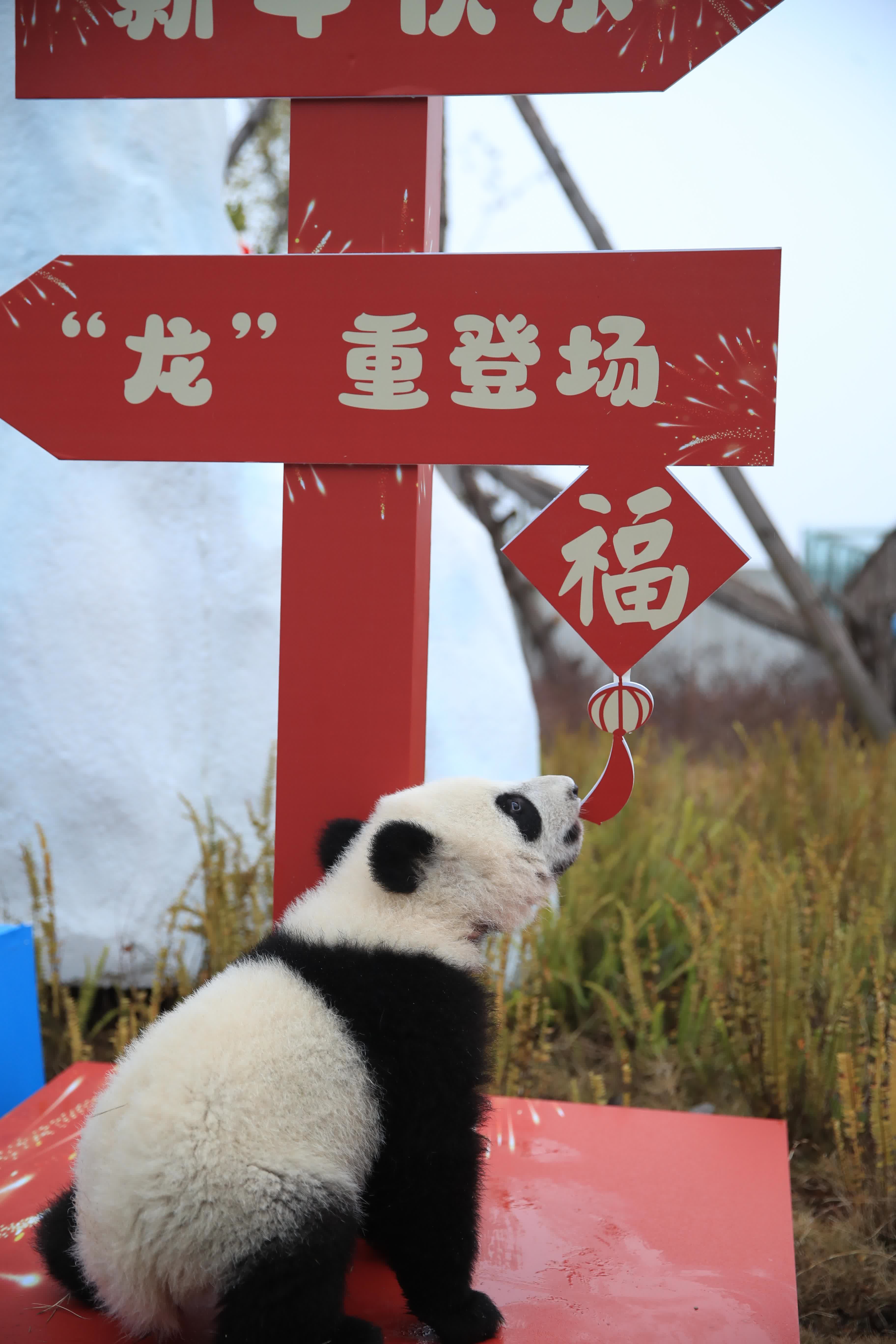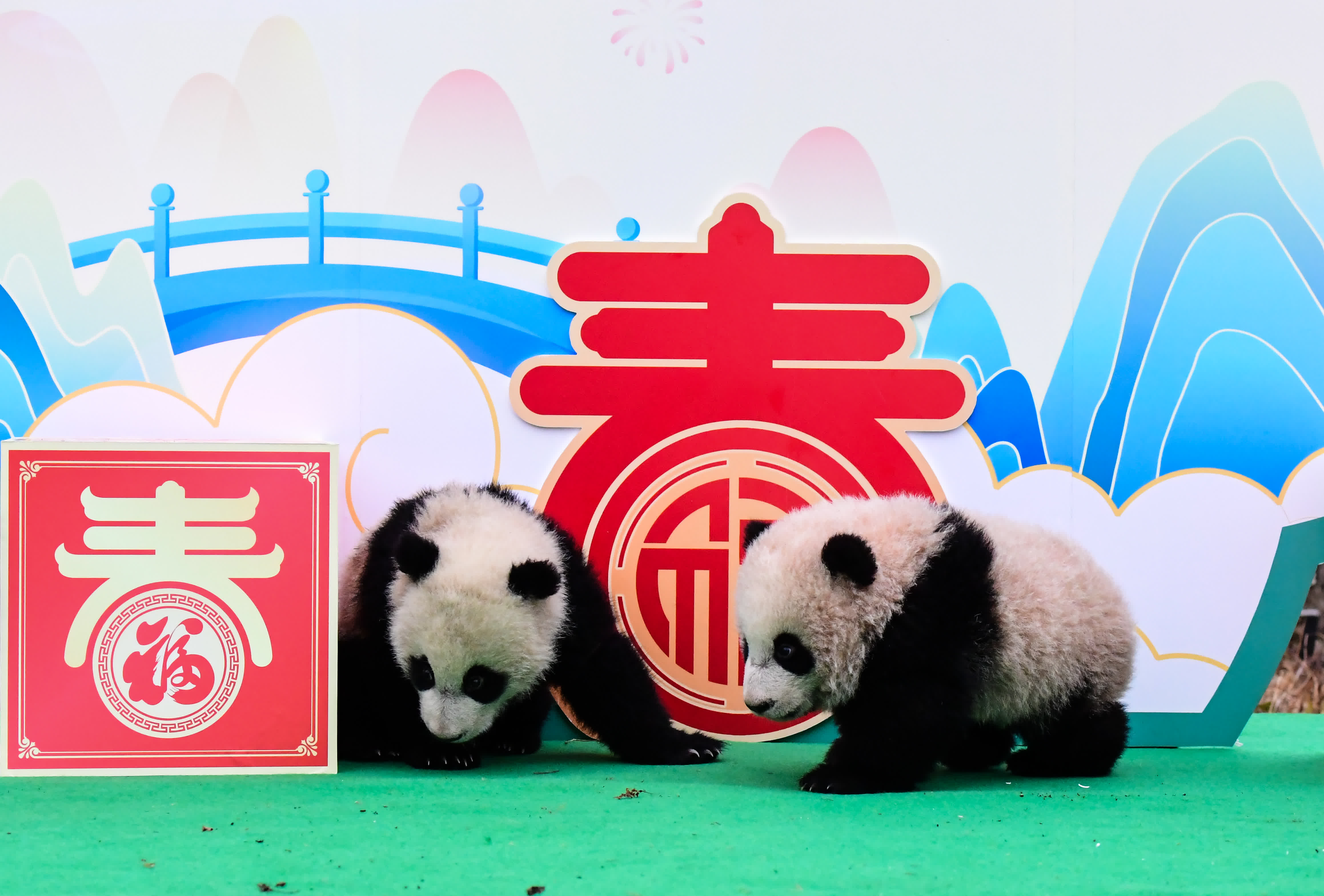 2023年熊貓中心和熊貓基地共成功繁育大熊貓34只,這些「糯米糰子」一亮相,就讓人挪不開眼。熊貓中心的展台位於臥龍神樹坪基地,主打「中國風」,以「中國紅」為主背景,設置了中國結、鞭炮、龍舟、龍形象的公仔裝飾;熊貓基地的展台位於北湖片區星星產房,以「冰雪斧頭山」為主題,布景以藍白色為主,背景板繪有雪人和雪花圖案,四周設置了雪山造型,整個場地充滿了「冰雪樂園」的氛圍感。