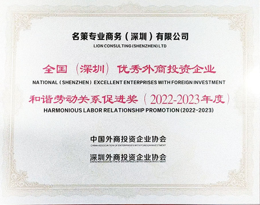 2023年度深圳外商投資企業協會年會、全國(深圳)優秀外商投資企業表彰大會日前在深圳五洲賓館舉行,商務部駐深辦,商務、市監、人社、工商聯等市政府有關部門負責人等500多位嘉賓共同出席。據悉,大會早前從外商投資企業協會4700多家企業中,評選出「優秀外商投資企業」等獎項,當中名策集團旗下的名策專業商務(深圳)有限公司獲頒「和諧勞動關係促進獎」稱號,是唯一一家從事專業服務業的獲獎企業。