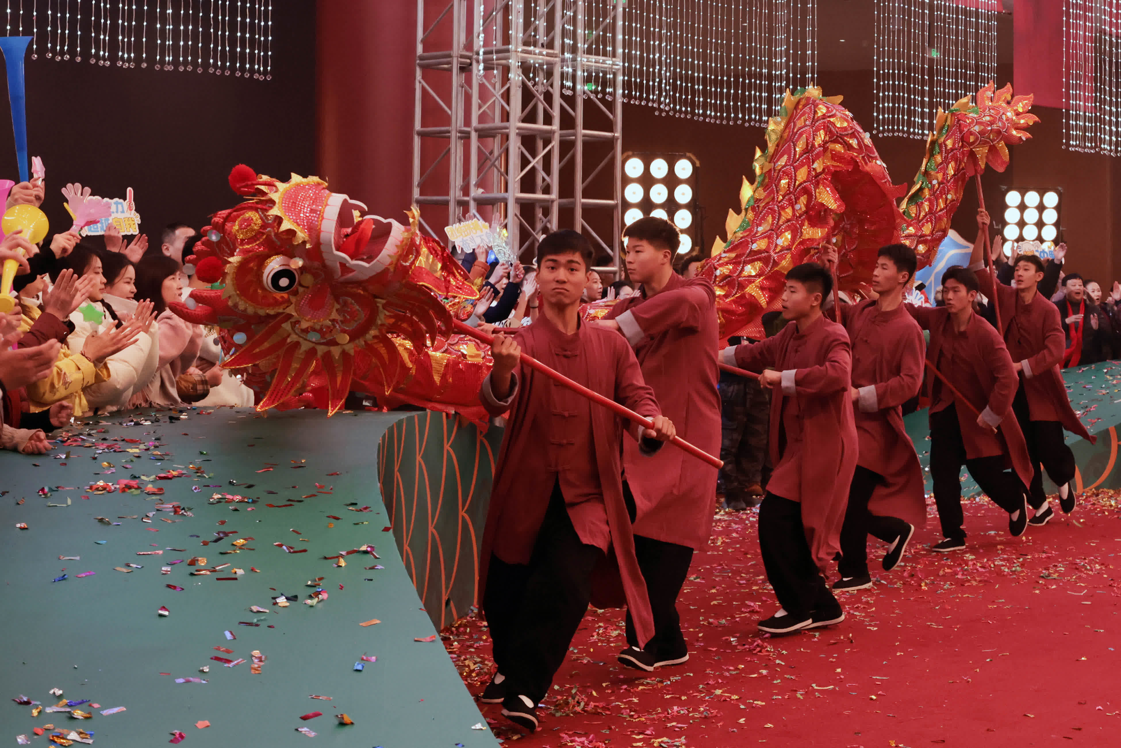 龍年春晚,當然少不了龍的元素,在開場《鼓舞龍騰》節目中,塔溝武校的功夫小子創新舞龍方式,契合中國新春喜慶祥和的氛圍。他們在武術動作中充分融入龍元素,以武術器械「雙鞭」為基礎,以紅色和黃色作為顏色的主基調,把傳統的多人舞龍改編成雙鞭龍和單人舞龍,並做出騰空的高難度動作,兼具柔美與力量的龍的形象,讓人耳目一新。