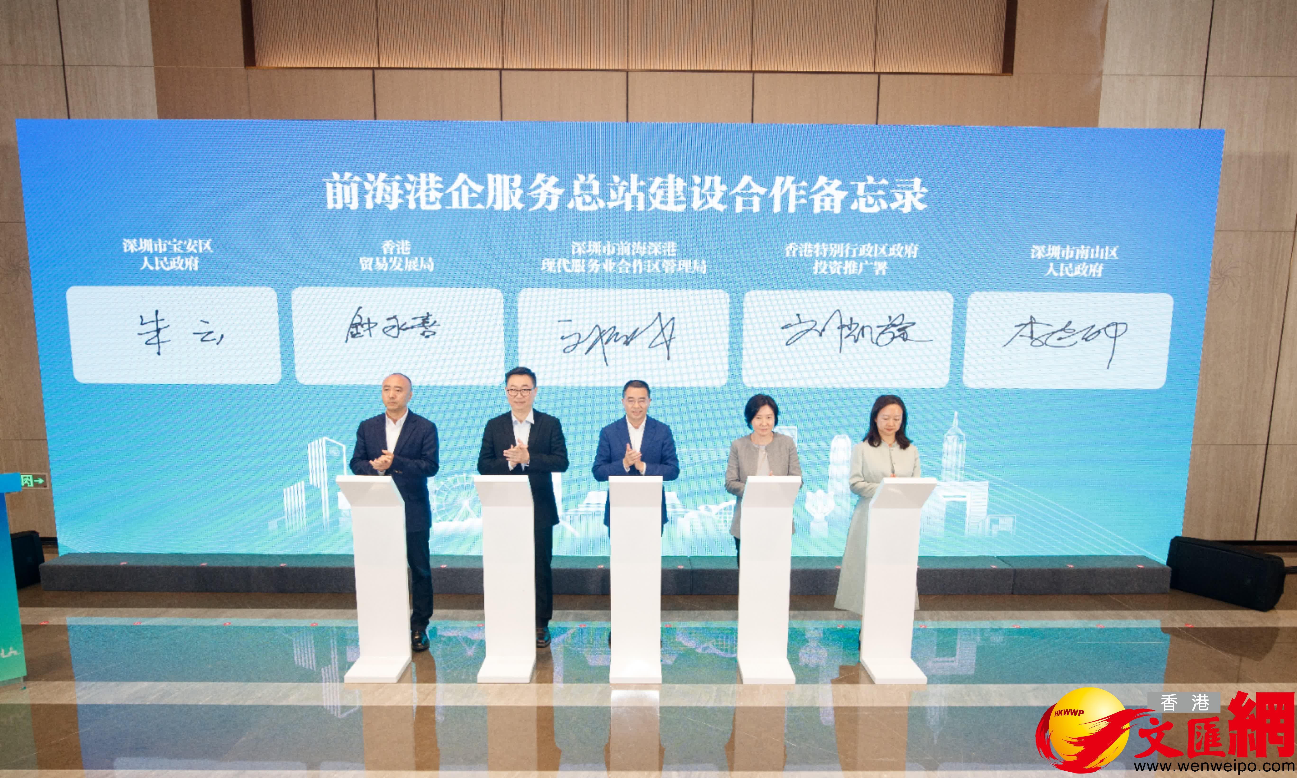 雙方現場簽訂《前海港企服務總站建設合作備忘錄》,將充分發揮前海「依託香港、服務內地、面向世界」的戰略平台作用及香港國際金融、貿易、航運中心和國際創新科技中心的優勢,在前海港企服務建設項目開展戰略合作。
