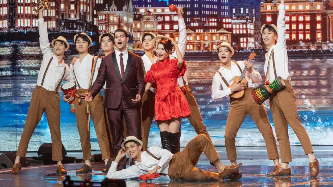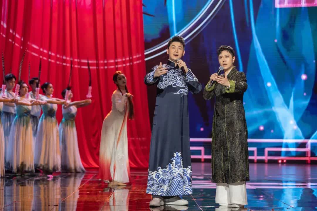 《念奴嬌·赤壁懷古》由裘識、王子演唱,通過將古典詩詞和戲腔唱法相融合,配合琵琶伴奏,讓中國傳統優秀文化在光影交錯間一展新貌。
