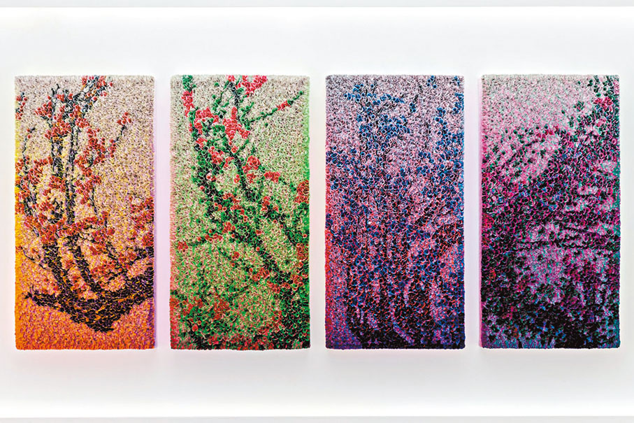 藝術家以其著名的花卉圖案為藝術語言,寄予生命新生的希望,展現幸福、充實和重獲新生的意象。他以強烈的視覺方式演繹個人故事與感知,平衡情感姿態和精心策劃的藝術性。「春花弄影」象徵着春天的重生,描繪出隨着時光流逝而永恒存在的美好。