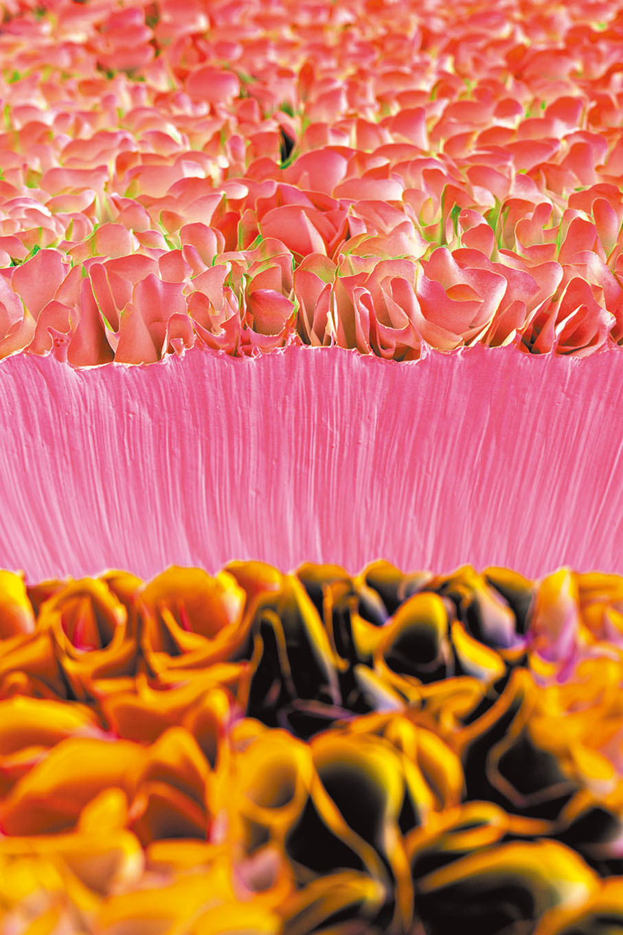 莊紅藝形容自己是「遊走於世界的藝術家」,九十年代在荷蘭上空鳥瞰盛放的花卉大地,啟迪了他往後具標誌性的創作風格。他透過觀察和感受自然萬物在光影之間的色彩變化,給他帶來的震撼、記憶來創作抽象作品。其特有的藝術專利「Flowerbed Colorchange」更是他作品中的獨特亮點,從左至右有隱約的色彩漸變,近賞時卻又渾然一體。這種奇幻的漸變效果讓觀眾有如置身於動感的花樣和韻律之中,近似轉動萬花筒般的視覺體驗。只有親自目睹者,才能完全體會到這種「移步換景」的魅力。