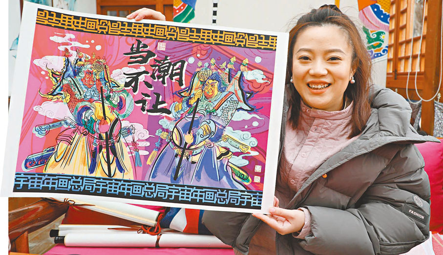 1989年出生的章昉,也是一位年畫非遺傳承人,她則選擇了從另一個角度創新。「在大學裏,我學的是動畫遊戲設計專業,感覺傳統年畫與年輕人的審美觀有些脫節。」章昉說,如今許多動漫人物與年畫中的人物形象相近,她從中受到啟示創作出一批「Q版年畫」,「這種非常卡通、特別萌的年畫,受到了年輕人的追捧。」
