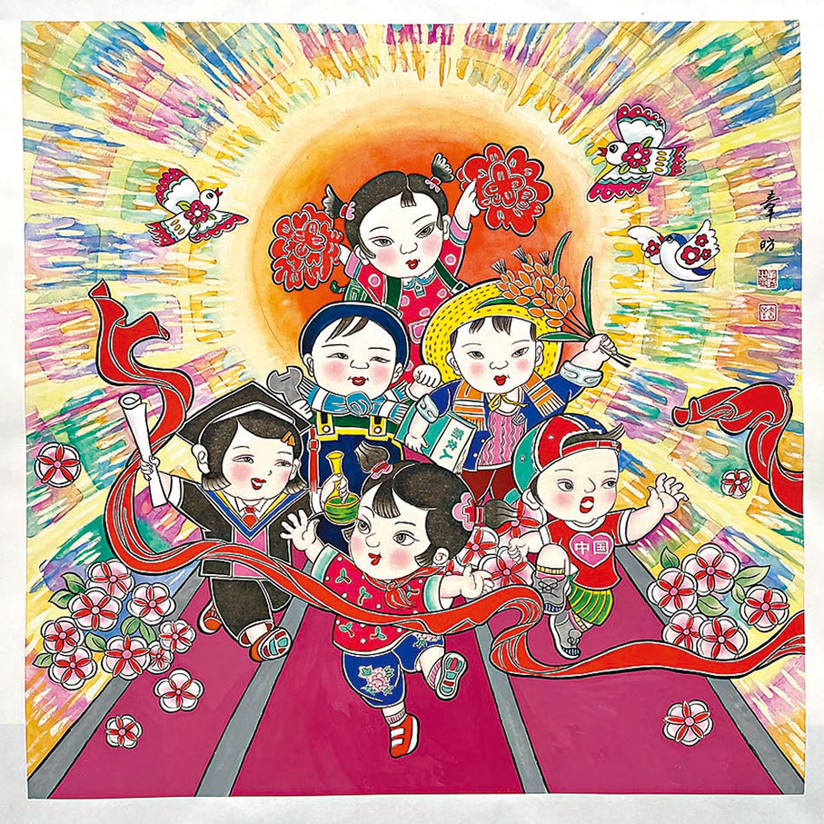 秦瓊、尉遲恭挺着一個大肚腩,身材呈S型,大臉、鳳眼,威武中顯出呆萌;人物形象粗狂,線條十分流暢,色調衝撞視覺衝擊力極強;作品命名《當潮不讓》,上下以膠片形式呈現「宇宙年畫總局」字樣。「這幅作品以年畫『填水腳』的手法創作,類似國畫中的大寫意,人物形象更加靈動。」章昉介紹,她積極從傳統年畫中汲取營養,在人物形象和創作技法上大膽創新,讓傳統年畫變得時尚。今年1月,她創作的《我們都在努力奔跑,我們都是追夢人》入選中央宣傳部、中美協主辦的「新生活、新風尚、新年畫」美術作品展。