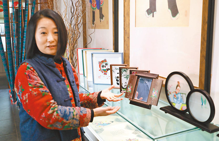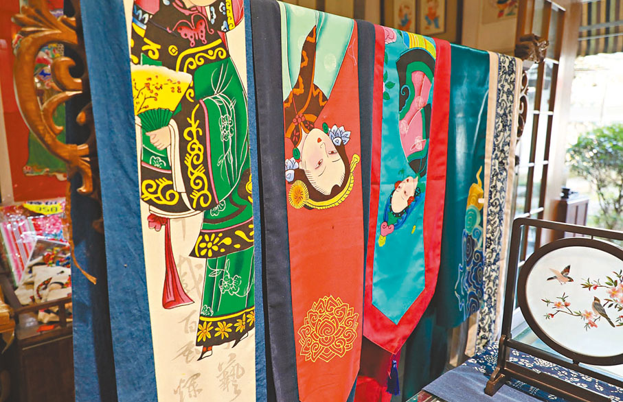 走進綿竹市年畫村「三彩畫坊」,一對門神屹立在兩扇大門上。推門而入,一個偌大的展廳呈現在面前,年畫條幅、刺繡斗方、精美擺件……琳琅滿目。穿着一身唐裝的賈君,一邊向客商介紹產品,一邊指揮調度門店、網購銷售,忙得不亦樂乎。