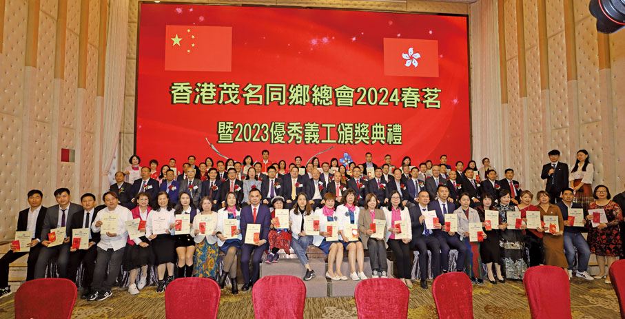 香港茂名同鄉總會(下簡稱「茂總」)日前(2月25日)假九龍灣百樂門酒樓舉行「2024年新春團拜暨2023優秀義工頒獎典禮」。活動邀得全國政協常委、香港廣東社團總會主席龔俊龍,茂名市委副書記羅晃浩,中央政府駐港聯絡辦新界工作部副部長、一級巡視員李功勳,中央政府駐港聯絡辦港島工作部副部長王卉,茂名市委常委、統戰部部長、茂名高新區黨工委書記吳衛華等出席主禮,與茂總首長及會員逾600人共聚一堂慶賀新春。茂總主席容冰表示,茂總不忘初心、牢記使命,始終帶領鄉親、會員砥礪前行,為香港、茂名兩地建設美好幸福添磚加瓦。