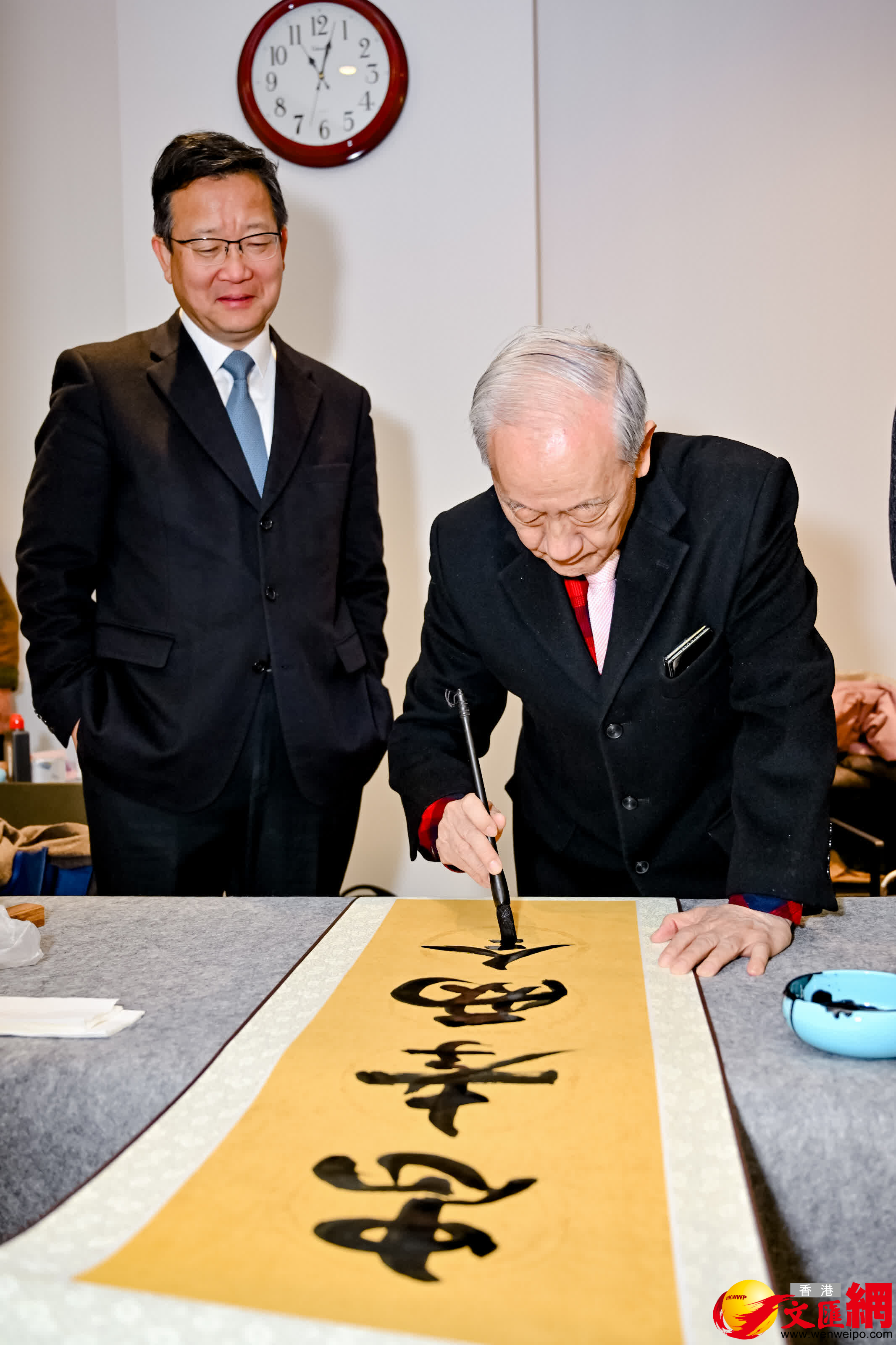 (香港文匯網記者 張帆)青山一道同雲雨,明月何曾是兩鄉。27日上午,「第四屆海峽兩岸新春書法筆會」在上海四行倉庫抗戰紀念館舉行,來自海峽兩岸的20餘位書畫家時隔三年首次齊聚線下,共同寫下「我是中國人,自有龍精神」。今年也恰逢黃埔軍校建校百年,大家還一起寫下了「發揚黃埔精神,共創民族復興」等字句,表達兩岸同胞攜手同心,加強文化交流,促進心靈契合的強烈意願。