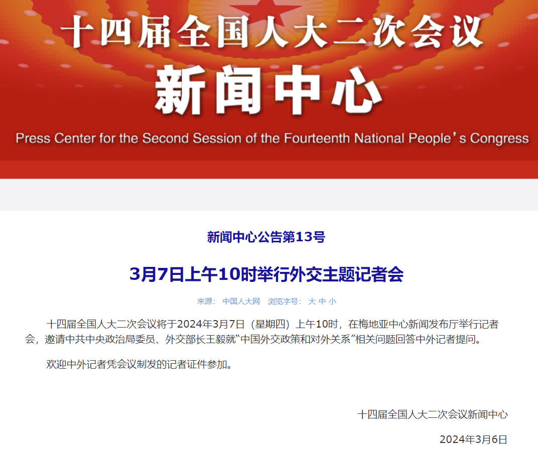 3月6日,中國人大網發布《新聞中心公告第13號 3月7日上午10時舉行外交主題記者會》: