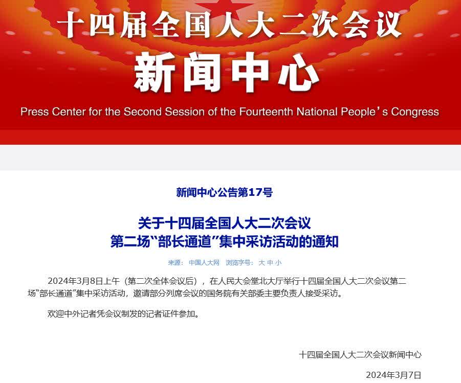 2024年3月8日上午(第二次全體會議後),在人民大會堂北大廳舉行十四屆全國人大二次會議第二場「部長通道」集中採訪活動,邀請部分列席會議的國務院有關部委主要負責人接受採訪。