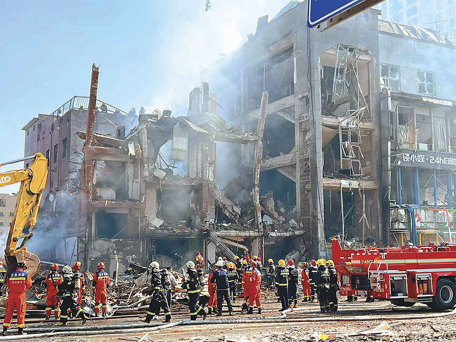 爆炸發生在迎賓路和學院大街交匯處,爆炸點受損最嚴重的是附近的一座簡易樓和幾間平房。上午10點,香港文匯報記者抵達現場,彼時現場已沒有明火,仍有濃煙從爆炸點附近升起,爆炸威力較大,對面大樓招牌被震歪,低樓層的玻璃幾乎全部被震碎。香港文匯報記者看到,爆炸發生的樓棟旁,有挖掘機正在清理建築殘渣,消防員不斷向發生爆炸的建築內部噴水,救援人員邊清理滿地殘渣邊展開搜救。因爆炸致建築物受損嚴重,一些水泥磚塊懸掛在建築殘留框架上,支撐柱已傾斜,現場搜救危險性較大。