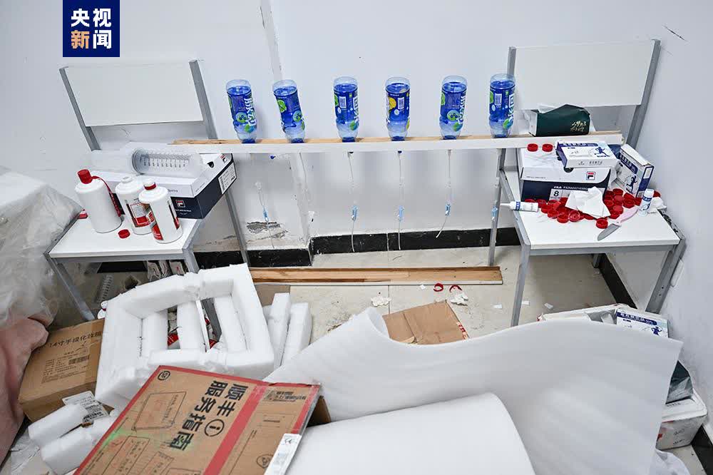 近期,上海浦東警方在巡查時從群眾處獲悉,時常聽到一個荒郊的小屋內傳出陣陣異響,上前敲門卻始終無人應答。民警了解到,該處民房原本是養殖場臨時搭建的一個小屋,多年前便已人去樓空,此時理應無人居住。隨後警方組織治安力量上門開展檢查,意外發現兩名青年男子蹲坐在地上,手持塑料桶將液體灌入一台機器之中,這裏竟然暗藏着一個製造假冒品牌洋酒的作坊。