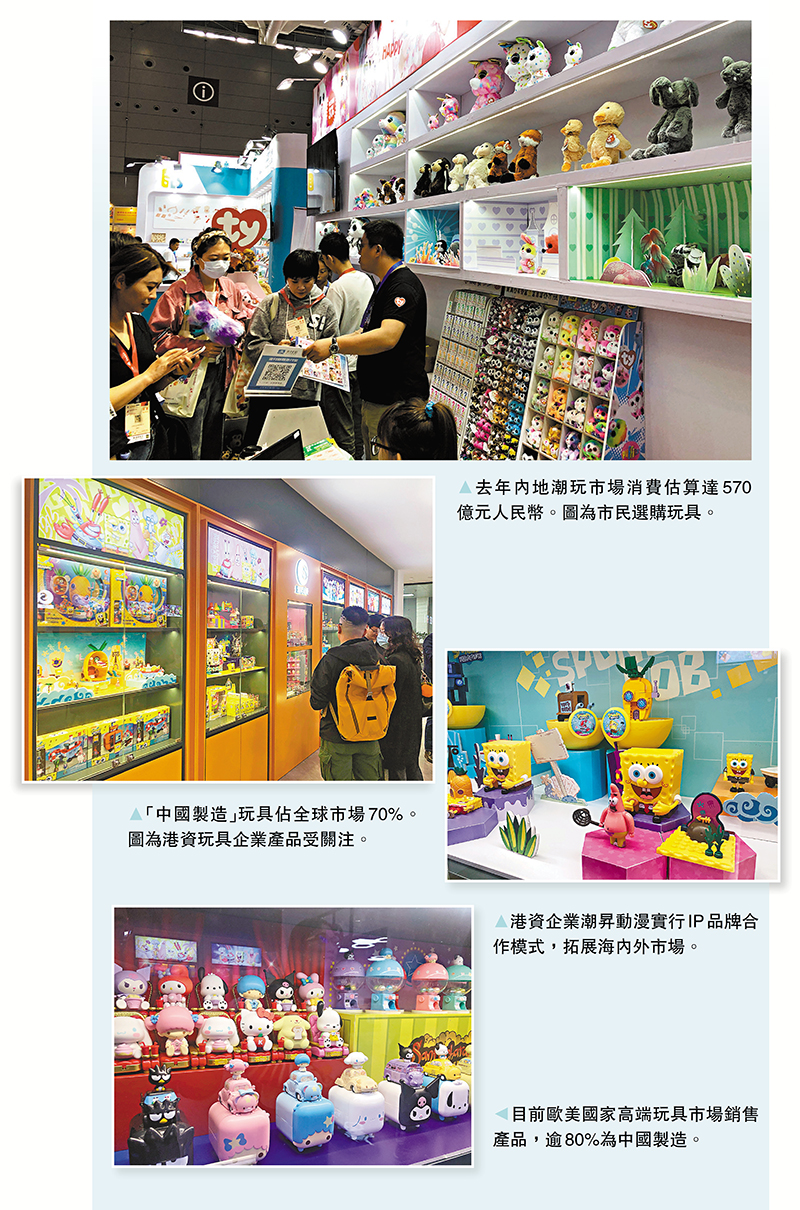 「像積木通用件,在廣東的玩具企業已能把誤差嚴格控制在0.02毫米以下;跨國公司技術要求高的產品,像電子、語音智能玩具等,通常更願意委託中國企業生產」,廣東省玩具協會會長陳黃漫表示,儘管東南亞、墨西哥等地玩具業持續發展,但「中國產」玩具佔據全球約70%市場,而在歐美國家高端玩具市場上銷售的產品,80%以上仍是中國製造。港資企業則憑借內地在玩具製造的龐大全球市佔規模優勢,瞄準IP授權與潮玩產品,多招式升級擴展客源。